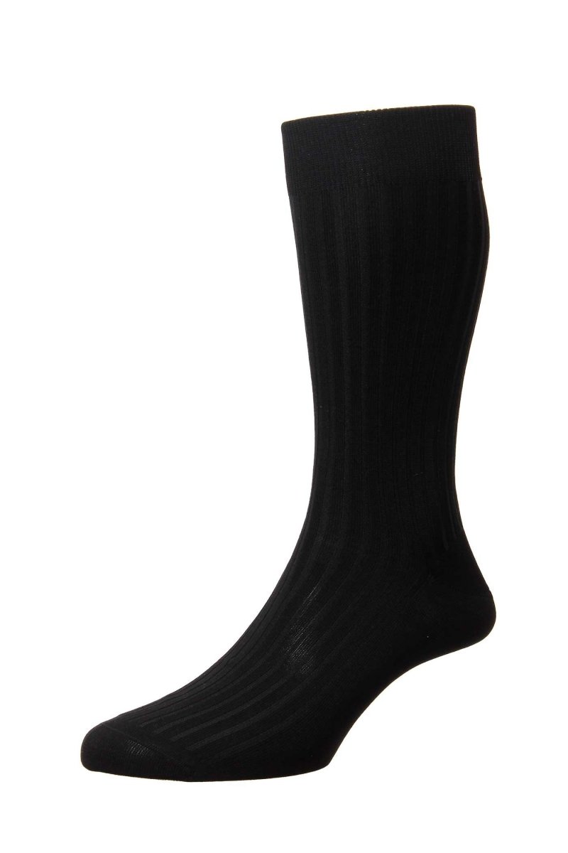 The Danvers dress socks in Black are a timeless essential for every wardrobe. Made from Pantherella’s signature cotton lisle, they provide superior breathability, a smooth finish, and a refined appearance. Rib knitted for comfort and durability, they are ideal for daily business wear and formal occasions.