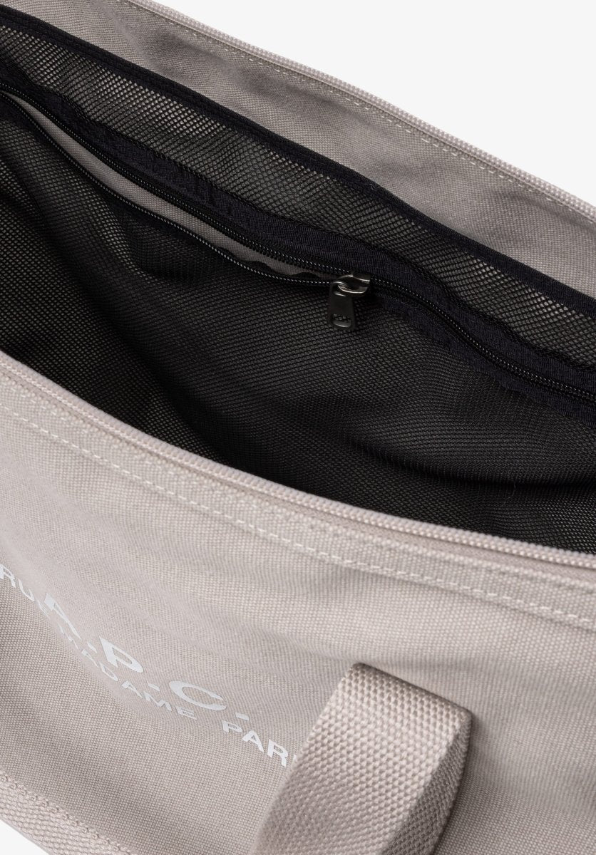Its structured duffle silhouette features sturdy top handles and an adjustable shoulder strap with a metal buckle, allowing it to be worn comfortably over the shoulder or crossbody. Inside, a zipped mesh pocket helps keep essentials organized, while the contrasting “A.P.C. Rue Madame Paris” logo adds a signature touch.