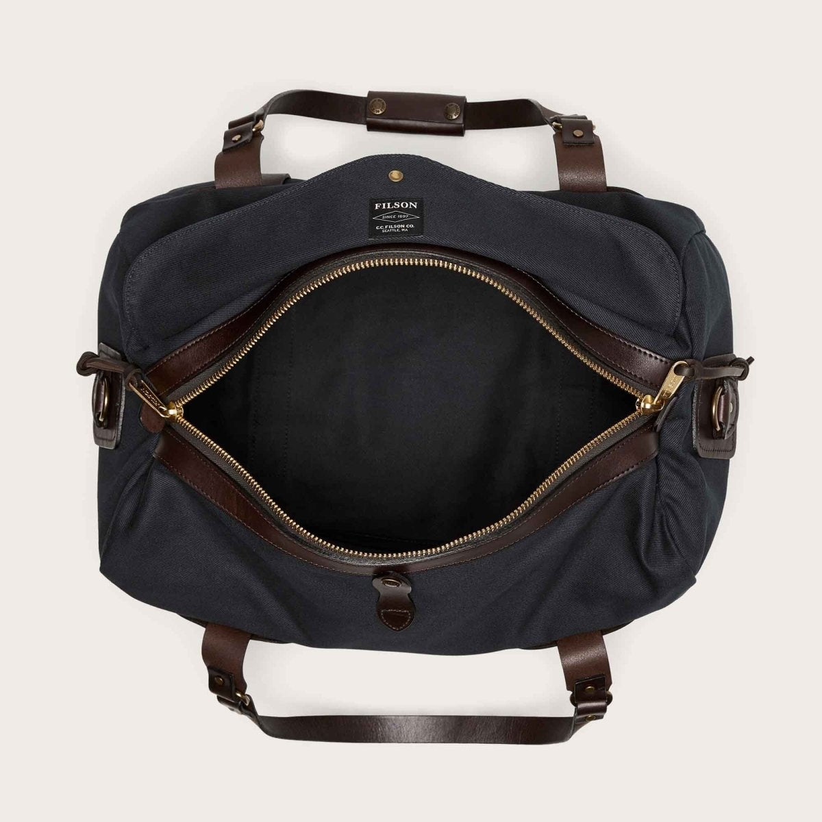 The Filson Rugged Twill Medium Duffle in Navy is built for a lifetime of travel. Crafted from water- and abrasion-resistant Rugged Twill and premium Italian cow leather, this duffle combines durability, function, and timeless style.