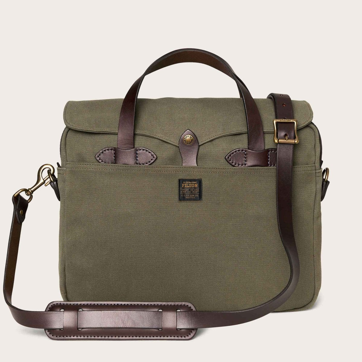 The Filson Original Briefcase in Otter Green is a timeless bestseller that combines durability, functionality, and classic style. Made from 22oz rugged twill (waxed cotton) and premium Bridle Leather, this bag is water-repellent, abrasion-resistant, and built to last a lifetime.