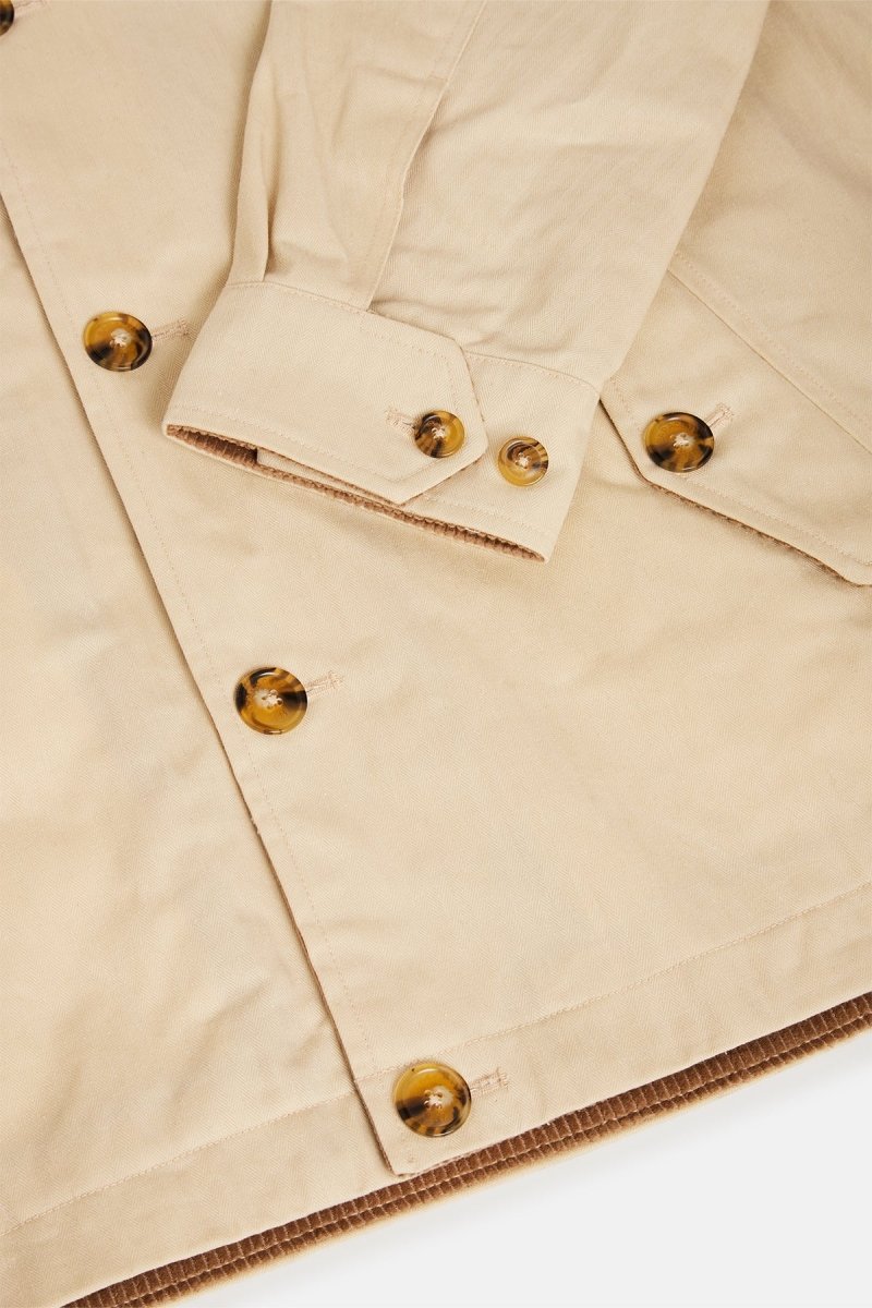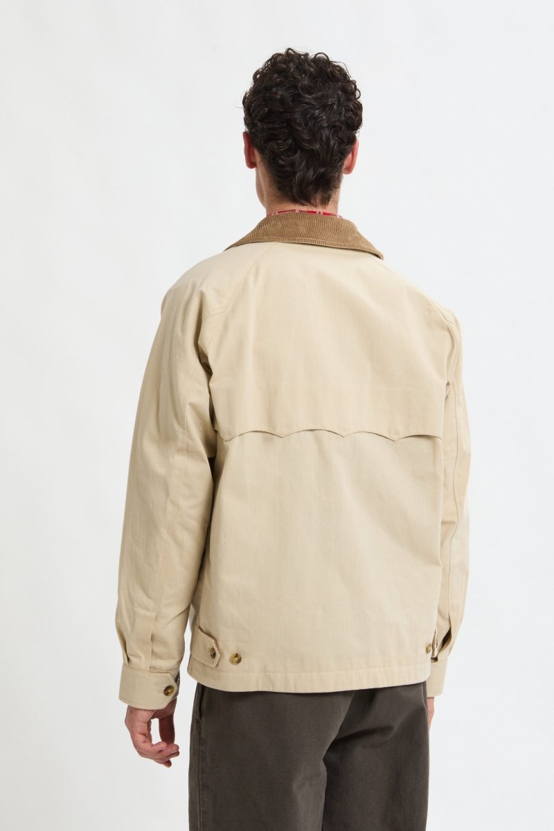 Made from British Millerain waxed cotton with a soft, matte finish, it offers light protection from wind and rain while maintaining a polished look. The corduroy collar and inner cuffs add both comfort and texture, and the Thermore® padding—partly made from recycled plastic bottles—ensures excellent insulation for cooler days.