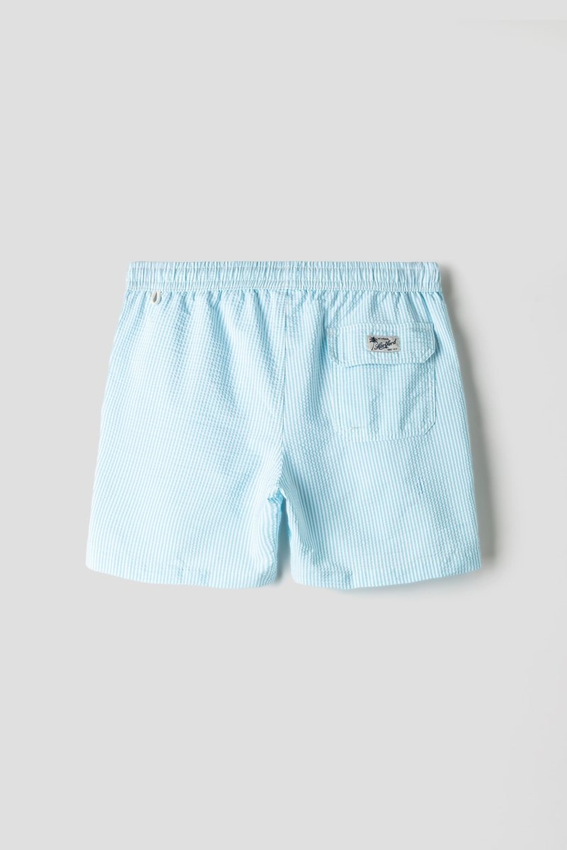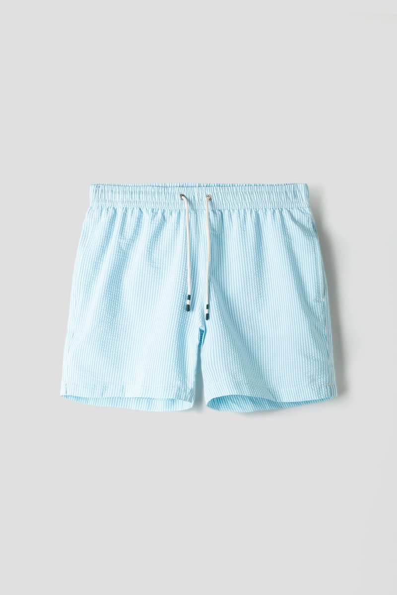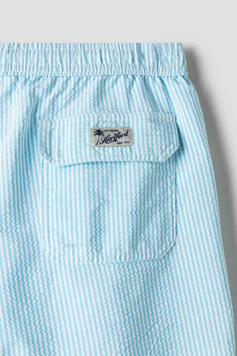 The Hartford Swim Seersucker Stripe in Turquoise captures effortless summer spirit with a refined French touch. Crafted from lightweight, quick-drying seersucker fabric, these swim shorts feature a classic vertical stripe pattern in fresh coral and white. The elasticated waistband with adjustable drawstring ensures a comfortable fit, while the textured seersucker structure enhances breathability and keeps the fabric slightly lifted from the skin – ideal for warm beach days and poolside lounging.