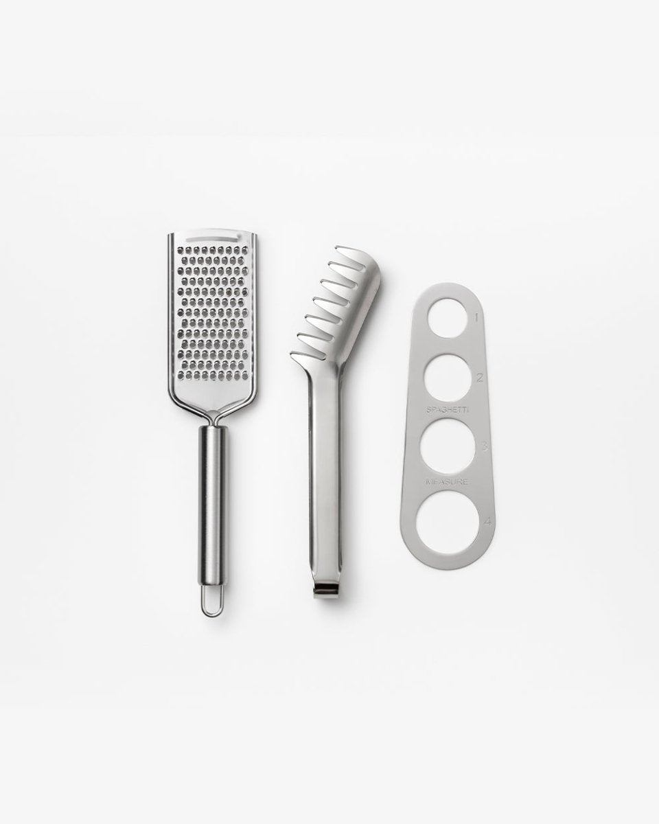 Discover the essential kit for stylish pasta evenings – elegantly packaged in a high-quality, book-like box. This set combines timeless design with practical functionality and is a real eye-catcher in any kitchen. When opened, it reveals carefully selected utensils that make every pasta night a breeze. All tools are made of high-quality stainless steel and are dishwasher safe.