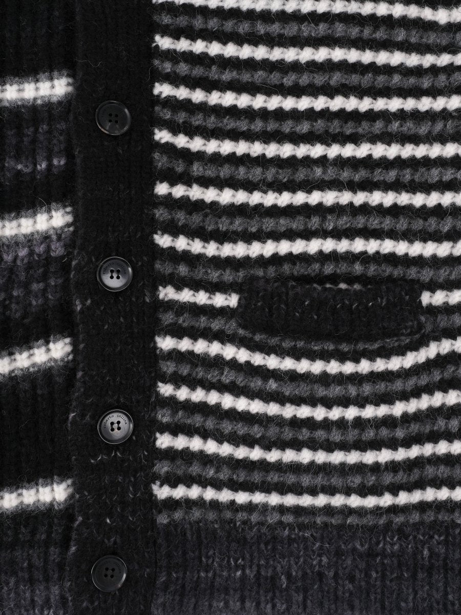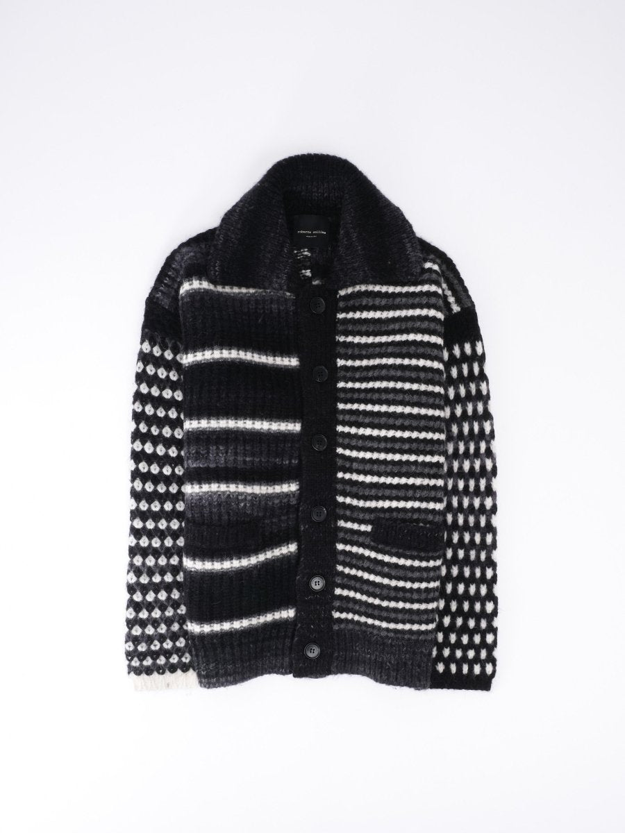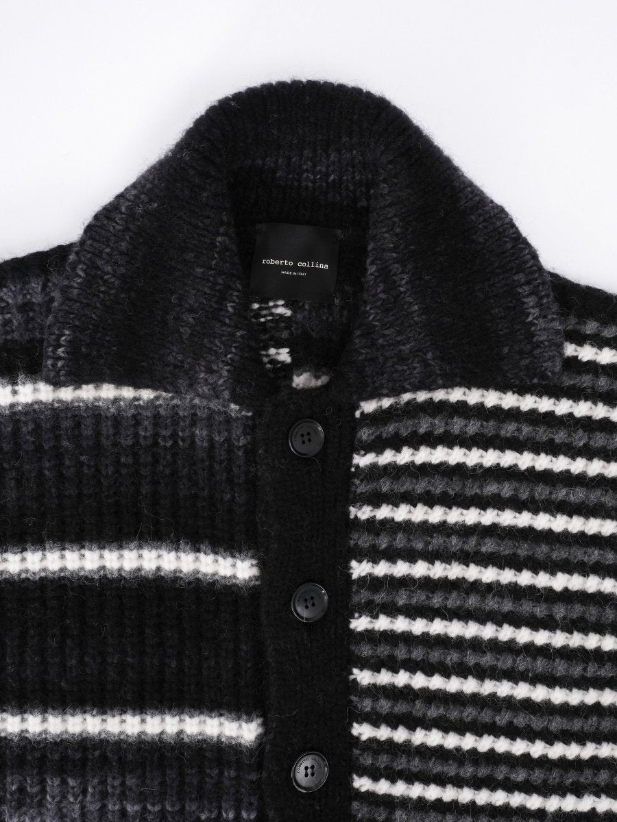 The Cardigan Shirt Multicolor in vibrant Nero/Grigio by Roberto Collina is a statement piece that combines luxurious comfort with Italian design excellence. Crafted in Italy from a premium blend of 50% Alpaca, 25% Wool, and 25% Polyamide, this luxurious alpaca cardigan offers exceptional softness, warmth and durability. Its eye-catching multicolor pattern and relaxed comfort fit create a modern, laid-back look while maintaining timeless elegance. Perfect for layering over shirts, tees or lightweight knits. This designer cardigan elevates any outfit with a bold yet sophisticated touch of Italian style.