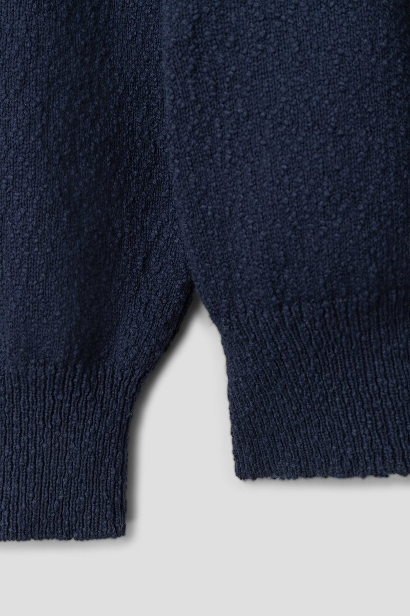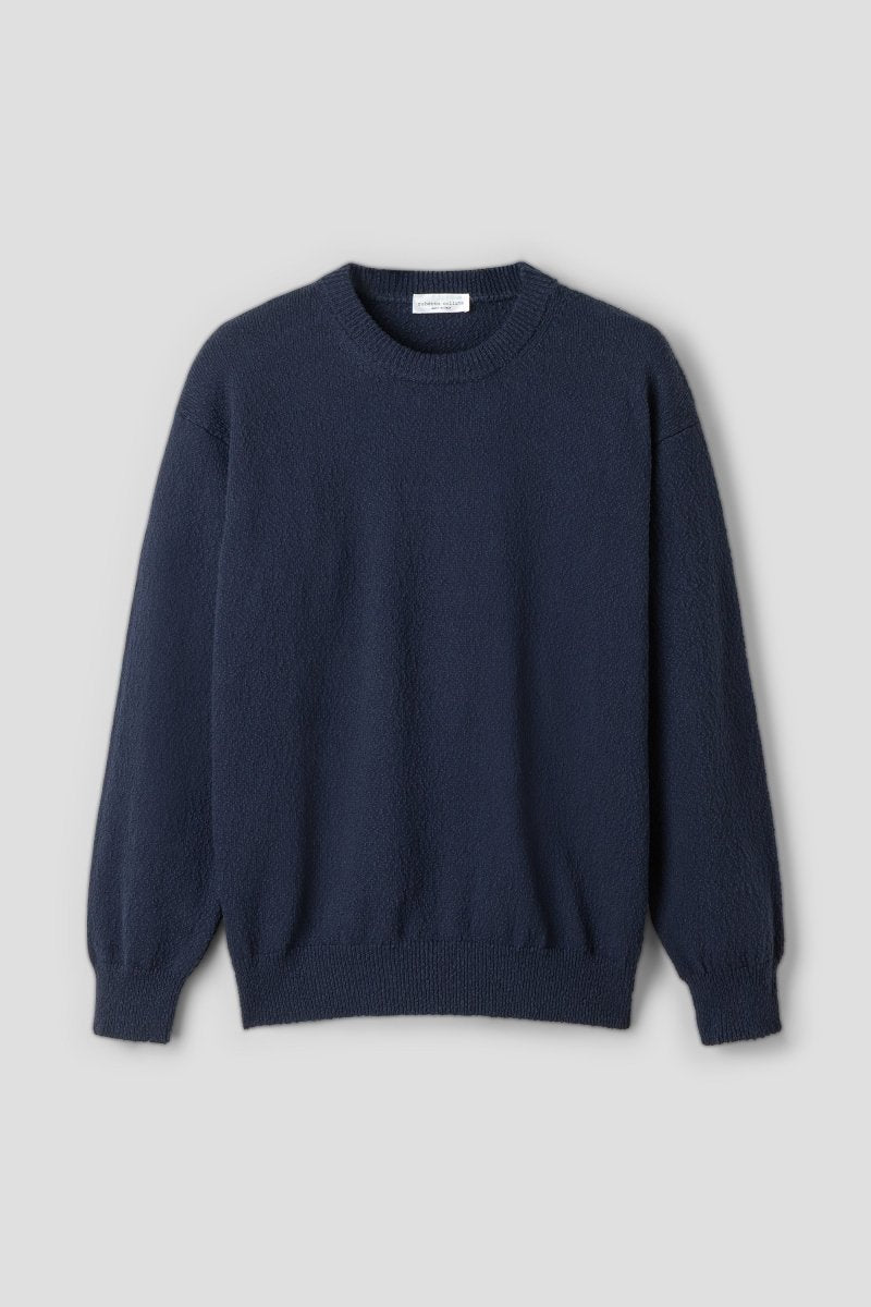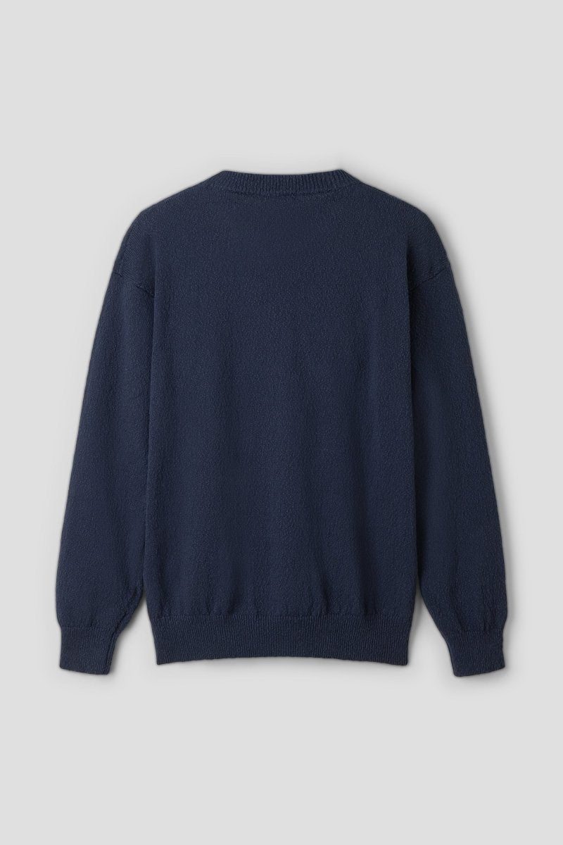 Designed in a comfort fit, it features a classic round neckline, ribbed collar, cuffs and hem, and a subtly textured surface that enhances its minimalist appeal. The deep navy tone offers timeless versatility, making it an essential layering piece for both tailored looks and elevated casual outfits.