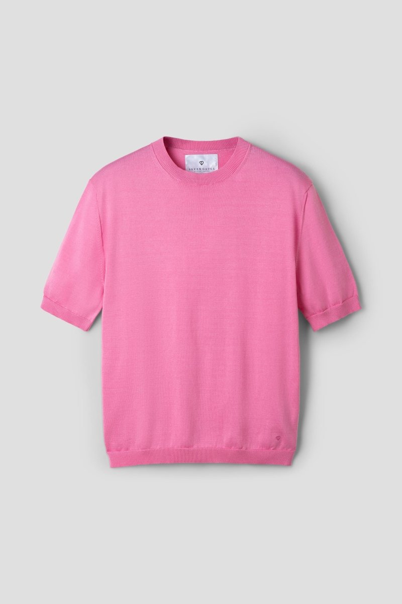 The Seven Gauge Light Cotton Pullover S/S in Pink is a refined warm-weather knit crafted from soft, lightweight cotton. Designed with a clean silhouette and fine gauge construction, this short-sleeve pullover offers breathable comfort and a smooth, premium hand feel. The subtle grey melange tone adds depth and versatility, making it an effortless layering piece for tailored trousers, denim, or summer suiting.