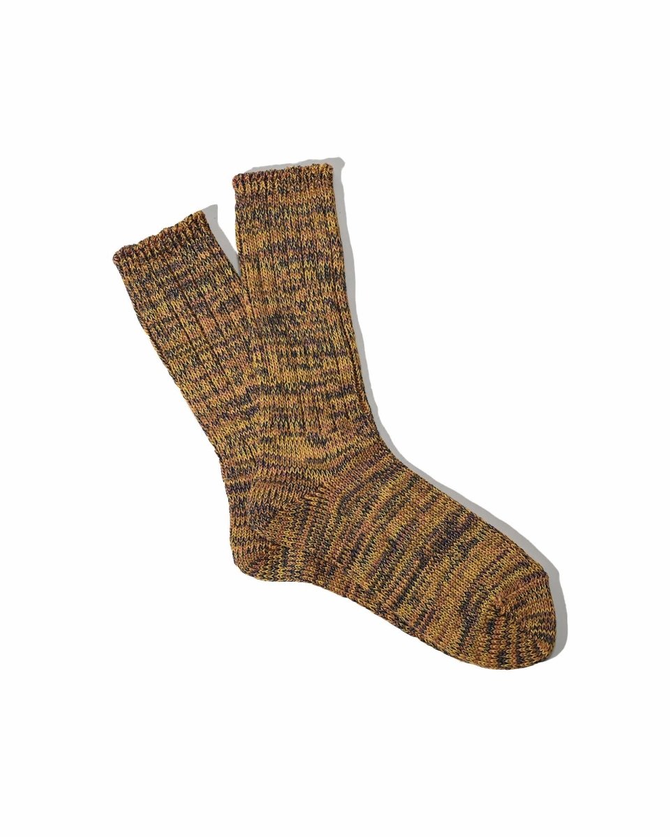 The 5-Color Mix Crew Socks in Yellow feature a bold mix of warm hues interwoven through Anonymous ISM’s signature low-gauge craftsmanship. Combining five vibrant threads, the fabric creates a rich marled texture that’s visually striking yet timeless. Durable, soft, and breathable — a colorful essential made in Japan.