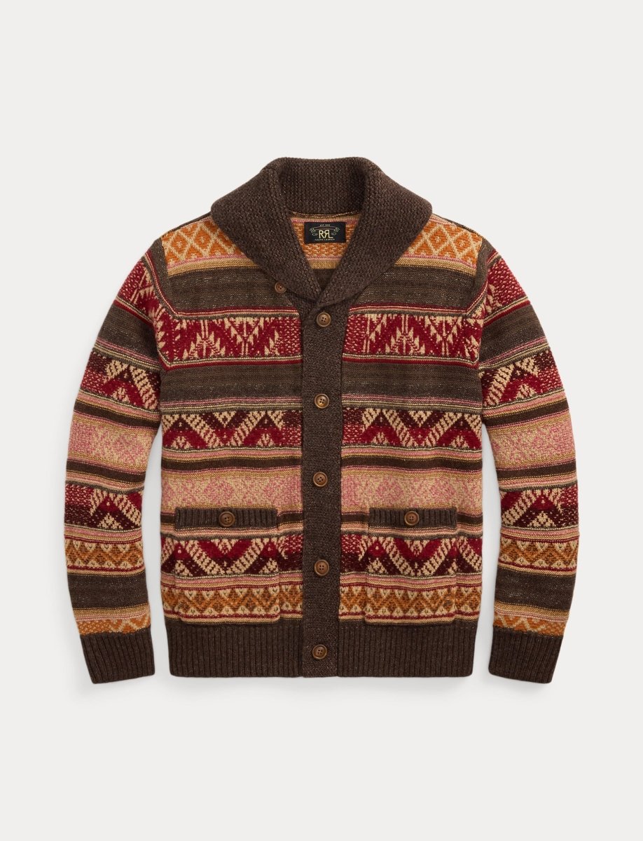 Inspired by a 1960s camp blanket, it features a striking mix of geometric and zigzag patterns throughout. The shawl collar and rib-knit cuffs and hem add structure and comfort, while genuine horn buttons complete the design with a refined touch. This piece perfectly captures RRL’s rugged Americana aesthetic — a timeless layer for cool-weather dressing.