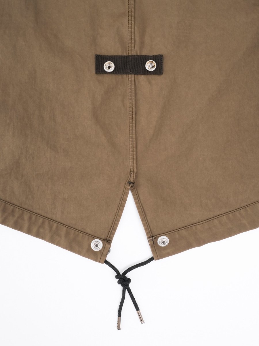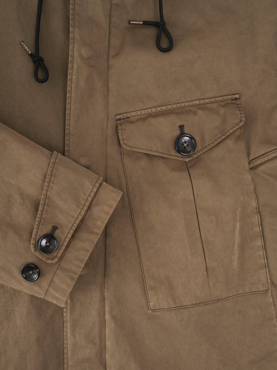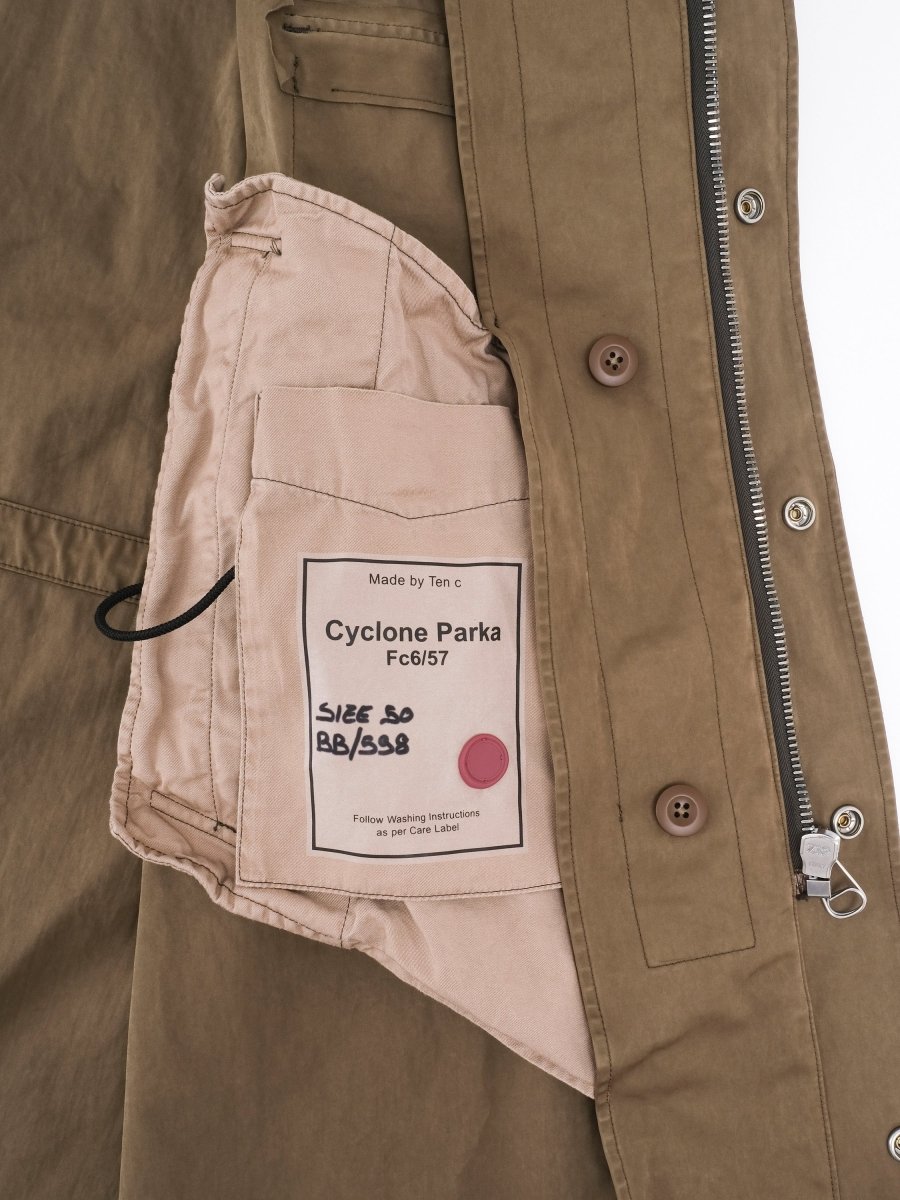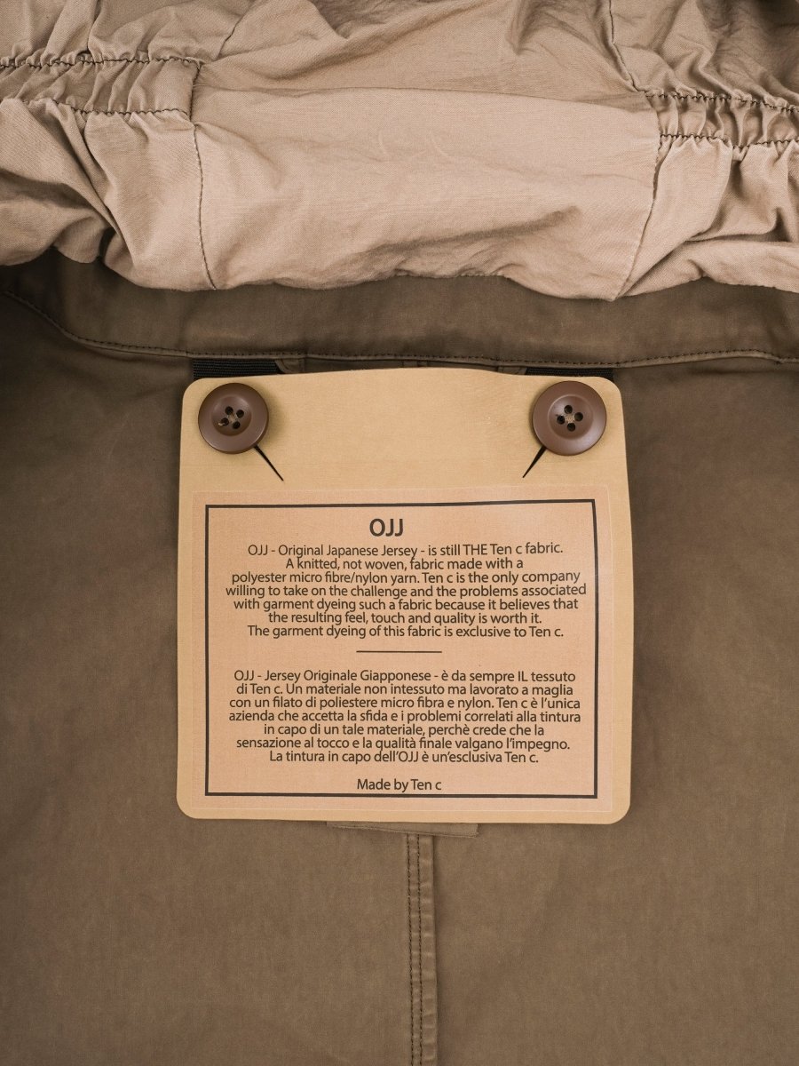 The Cyclone Parka by Ten C embodies the brand’s philosophy of durability, design and evolution. Crafted from OJJ – Original Japanese Jersey, a unique fabric made of 60% polyester and 40% nylon, it offers a waterproof and wind-resistant shell with a distinctive garment-dyed finish. Featuring a classic parka silhouette, this jacket includes one buttoned pocket and two side entry pockets for functionality. The adjustable hood provides extra protection for the neck and includes a loop detail for added practicality. A button-in down liner allows seasonal versatility, while the slim fit ensures a refined, modern look.