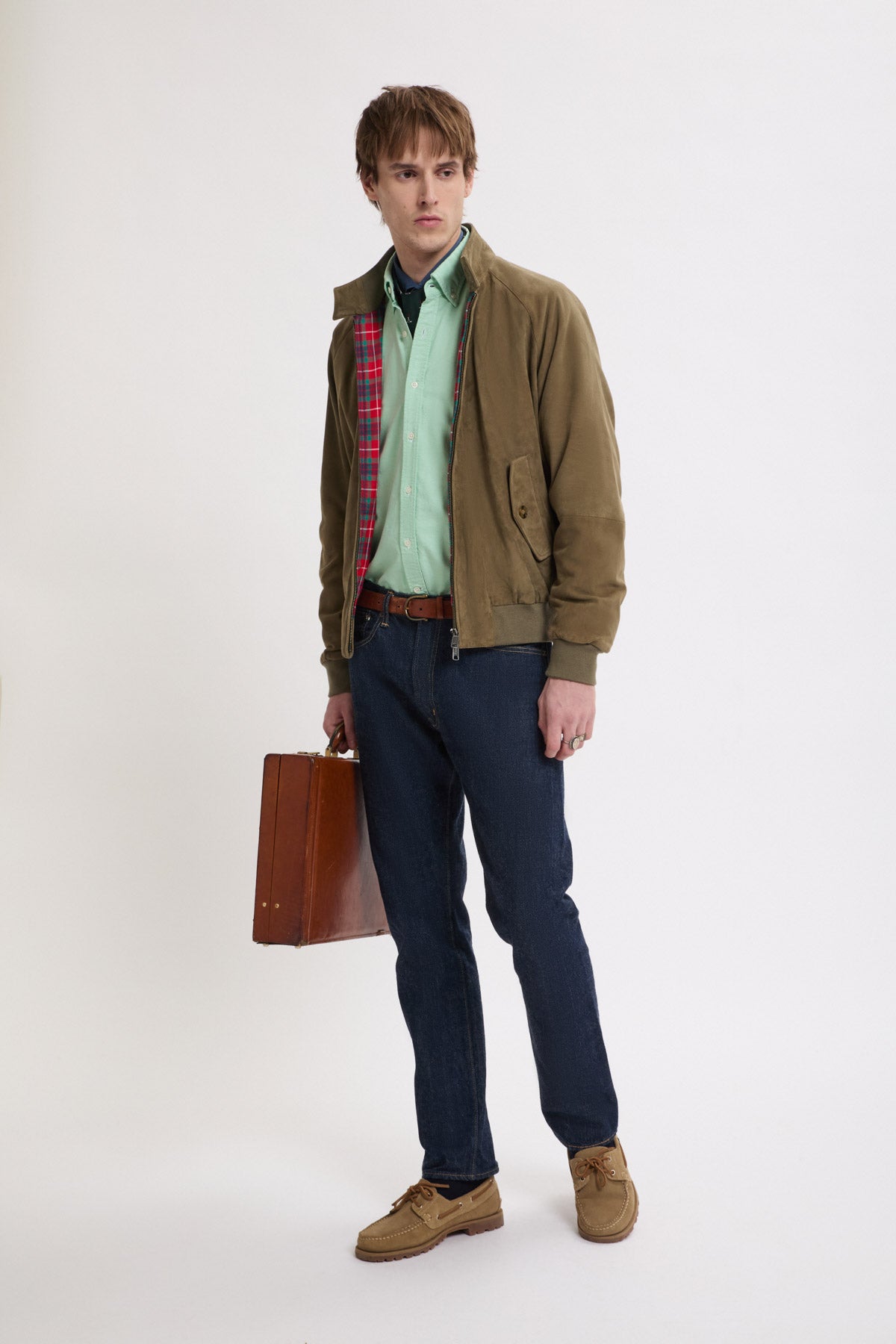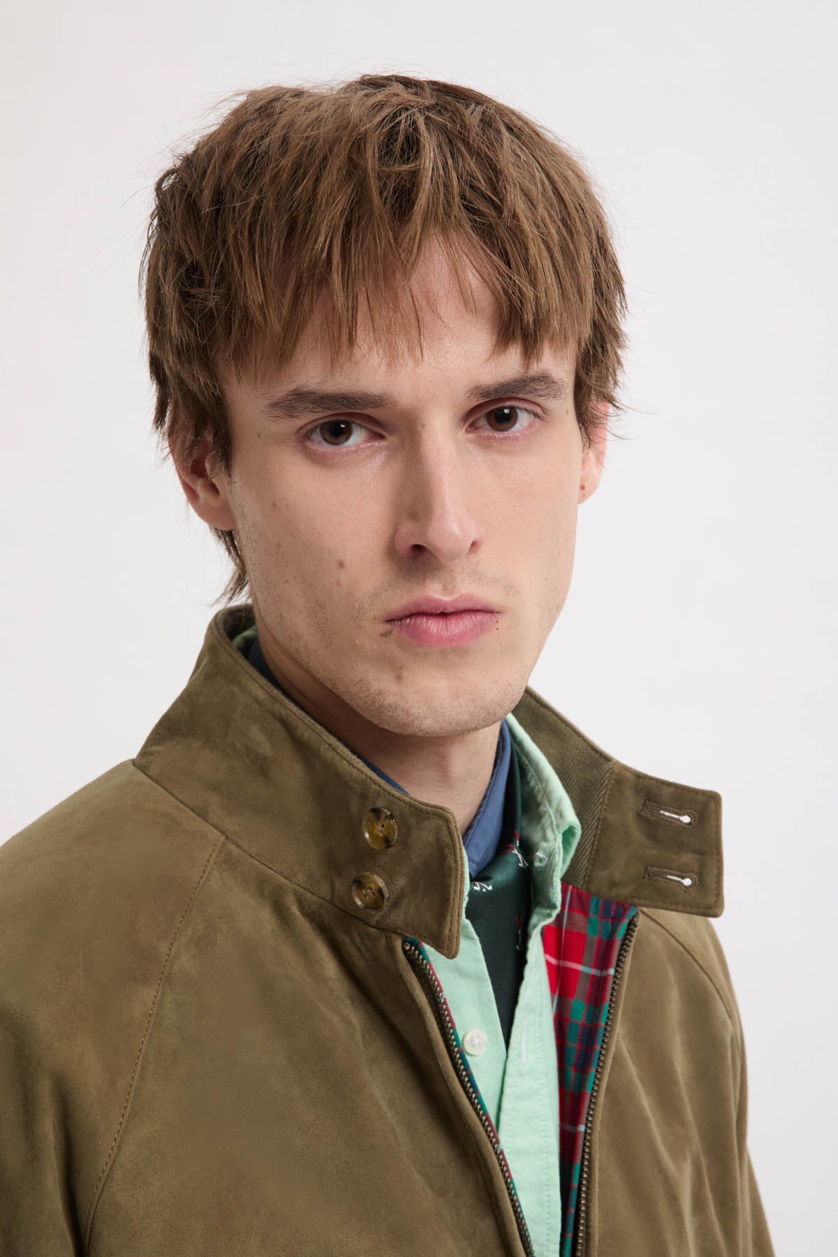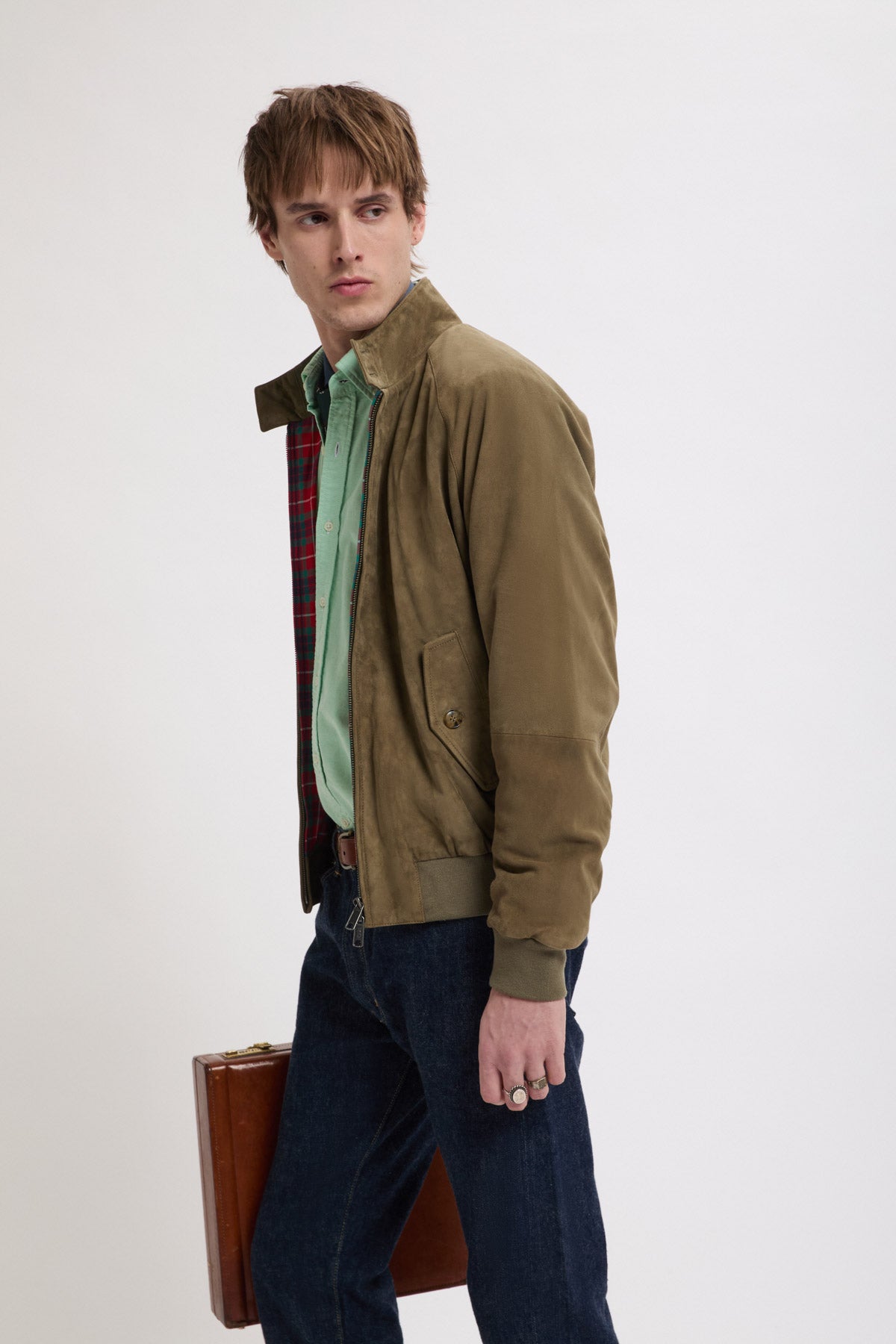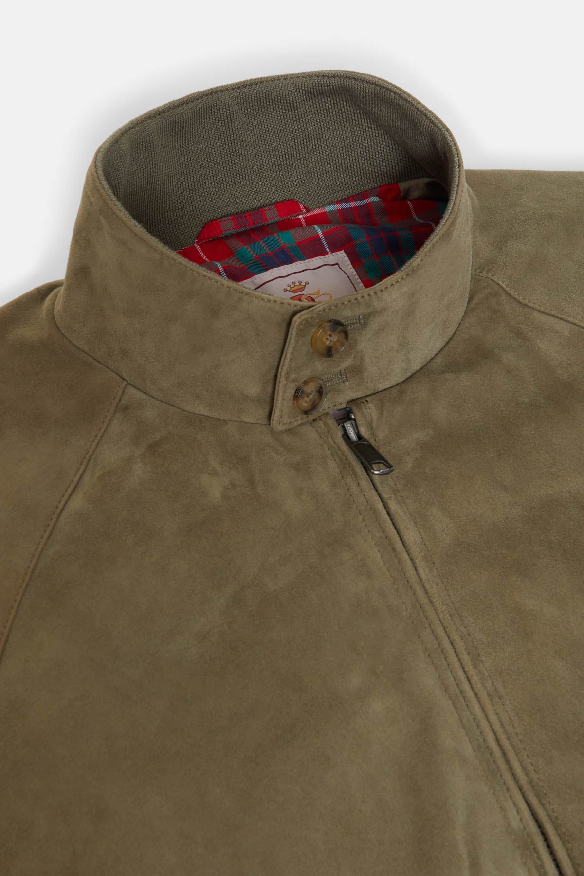 You can never go wrong with a Suede Jacket. The G9 Suede is the classic Harrington Jacket in fine suede. This garment has made a name for itself and become extremely popular over the years due to its versatility, making it a real style icon. It features our breathable Fraser Tartan lining made from Coolmax® fabric, two-button dog ear collar, slanted side pockets, our signature umbrella back yoke, and ribbed cuffs, waistband and inner collar.