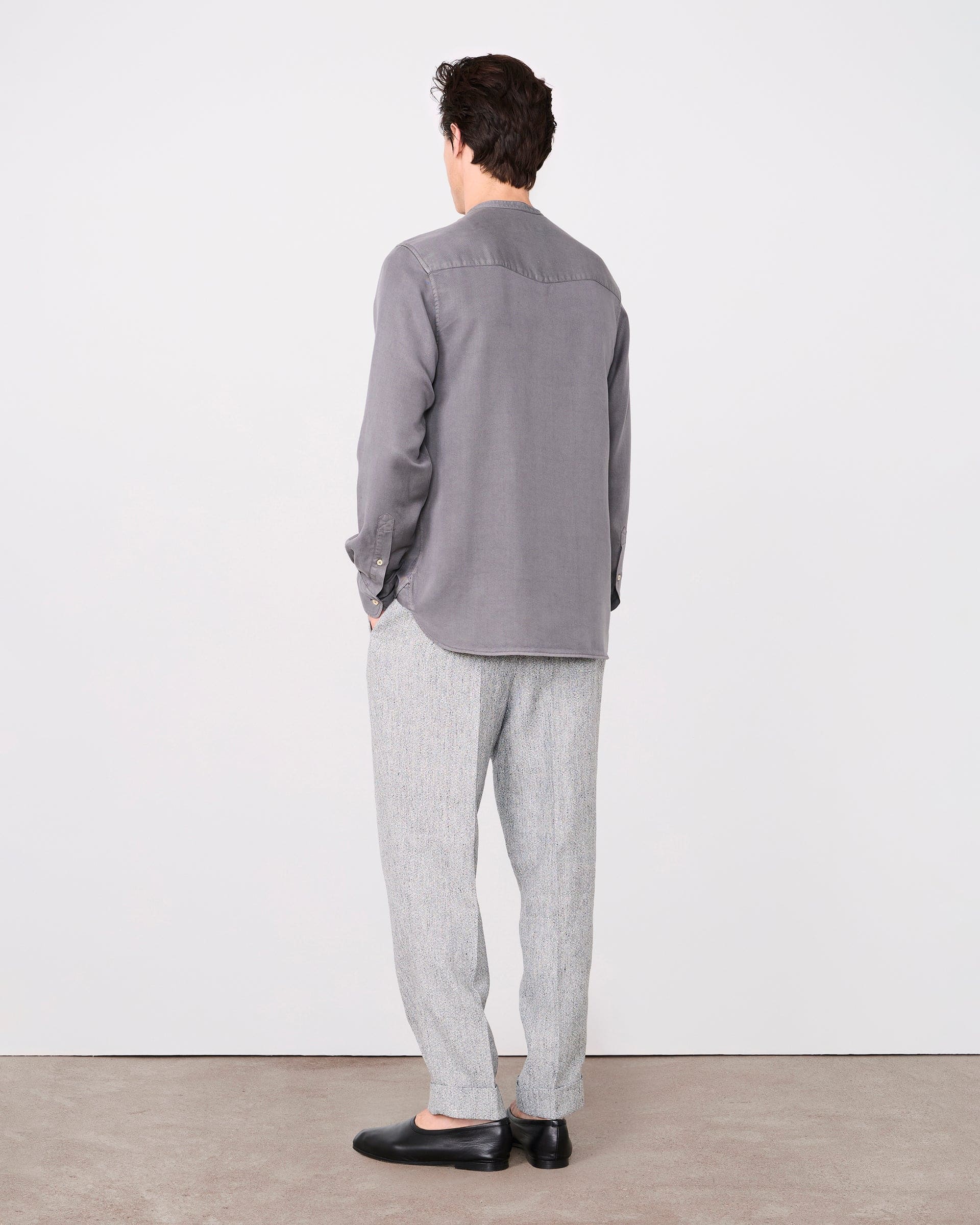 The clean band collar enhances the contemporary silhouette, while the smooth lyocell fabric provides a subtle sheen and breathable comfort. Garment dyeing gives the shirt its distinctive Smoked Pearl tone and a naturally lived-in character.