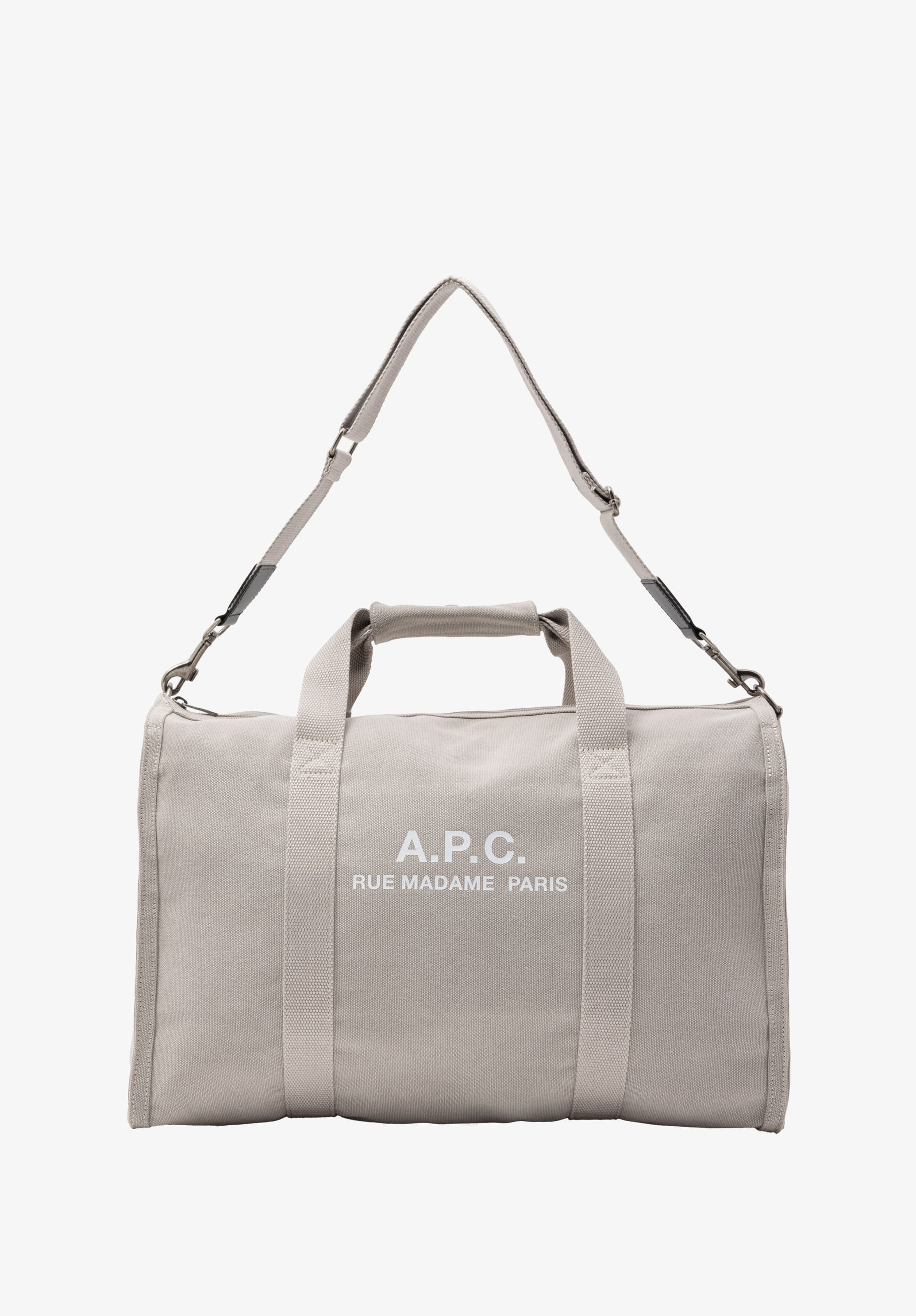 Its structured duffle silhouette features sturdy top handles and an adjustable shoulder strap with a metal buckle, allowing it to be worn comfortably over the shoulder or crossbody. Inside, a zipped mesh pocket helps keep essentials organized, while the contrasting “A.P.C. Rue Madame Paris” logo adds a signature touch.