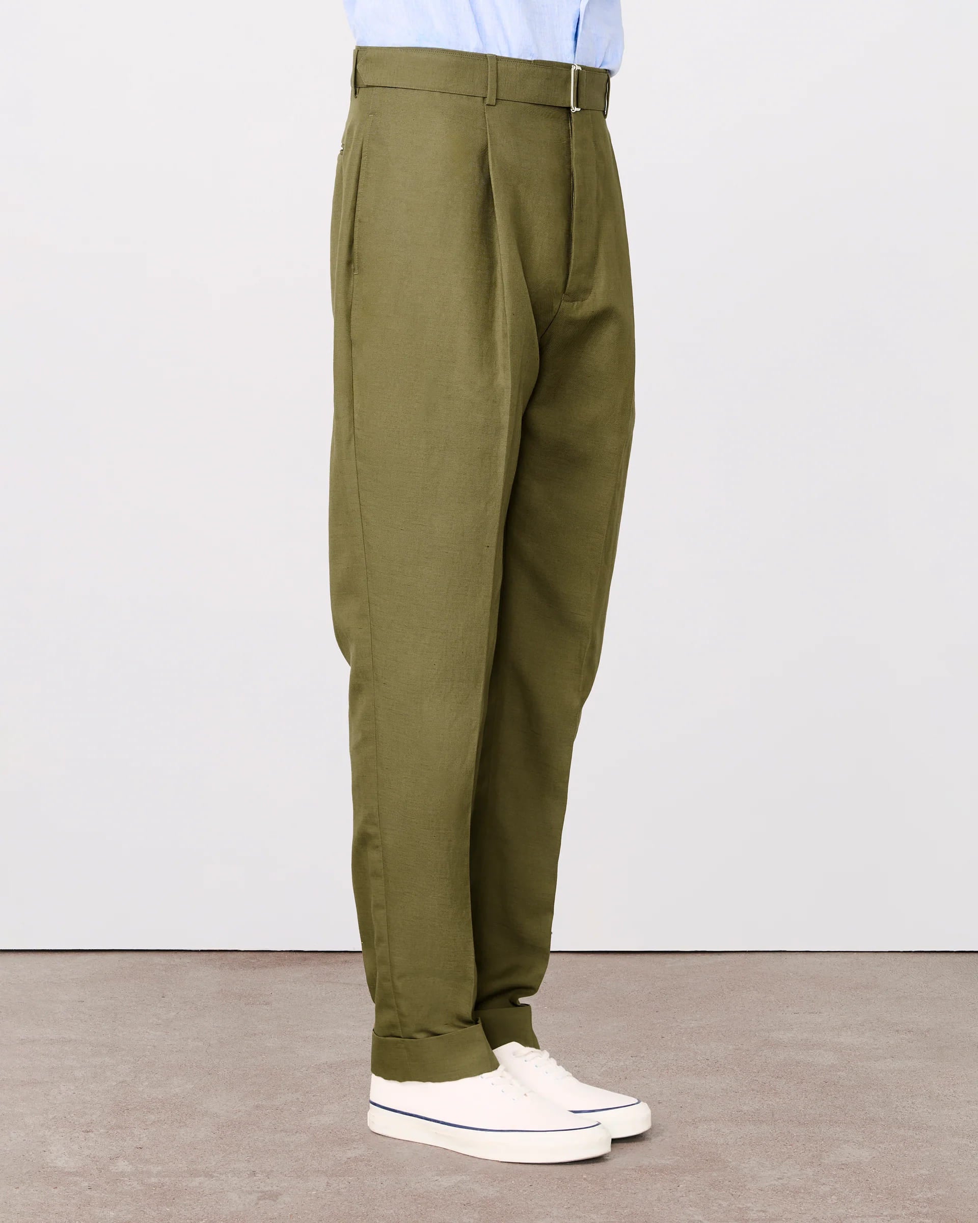 Designed with a cropped silhouette and a gently tapered leg, the Hugo Pants deliver a modern yet timeless tailored look. A single Italian front pleat adds elegant volume, while the textured cotton-linen fabric ensures breathability and ease throughout the day.
