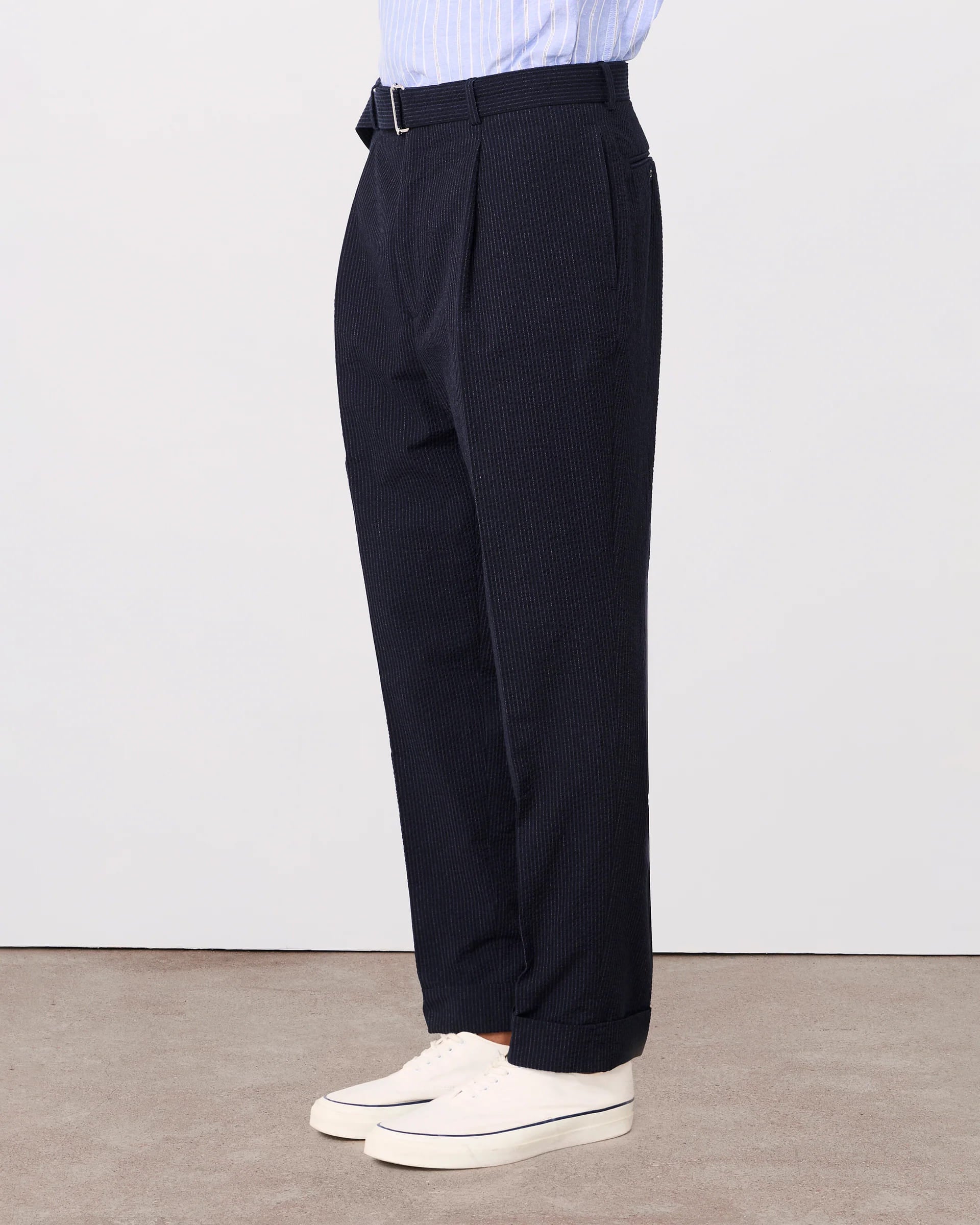 Designed with a cropped silhouette and a gently tapered leg, the Hugo Pants offer a modern yet timeless fit. A single Italian front pleat adds structure and elegance, while the textured seersucker fabric enhances airflow and creates the characteristic puckered finish.