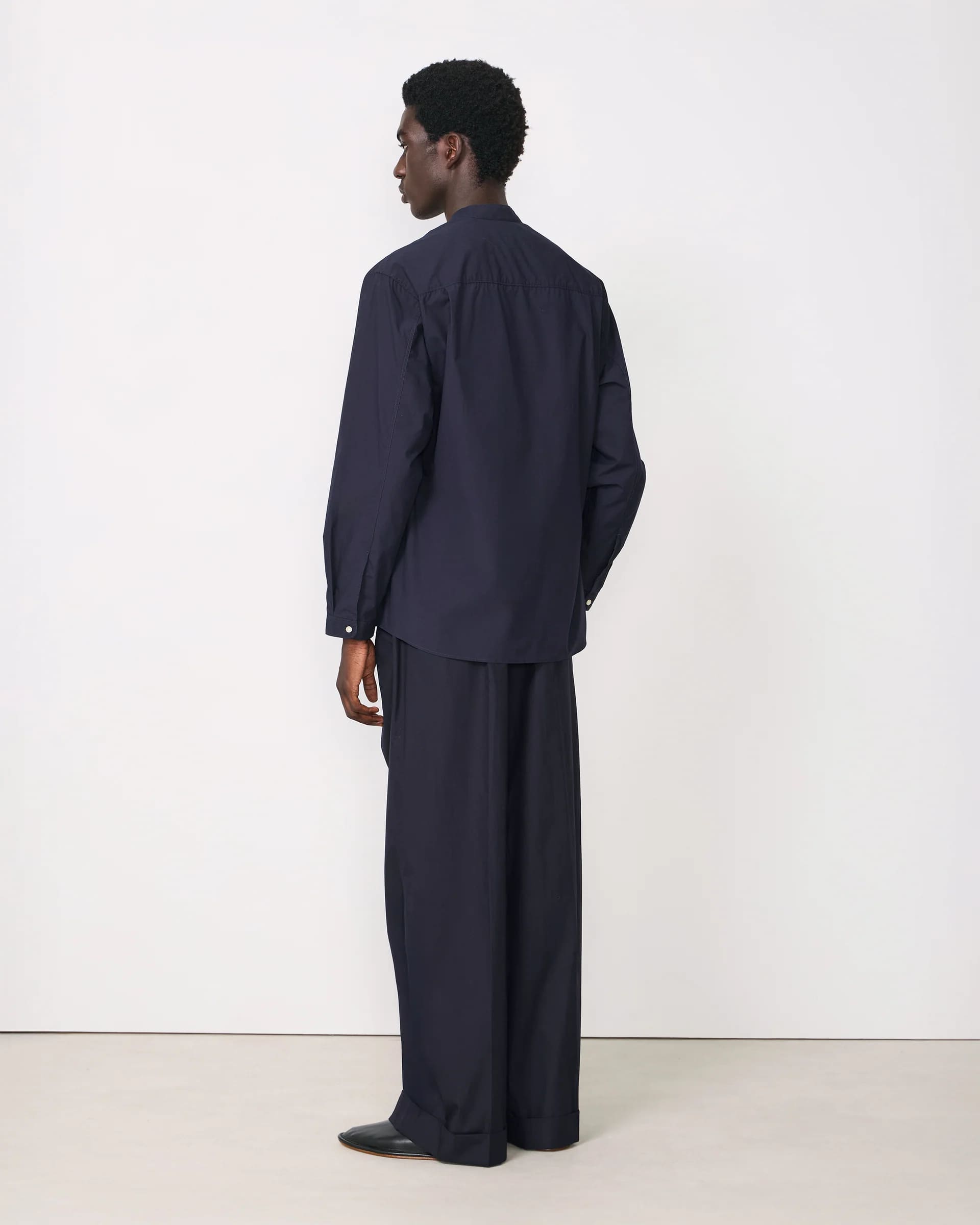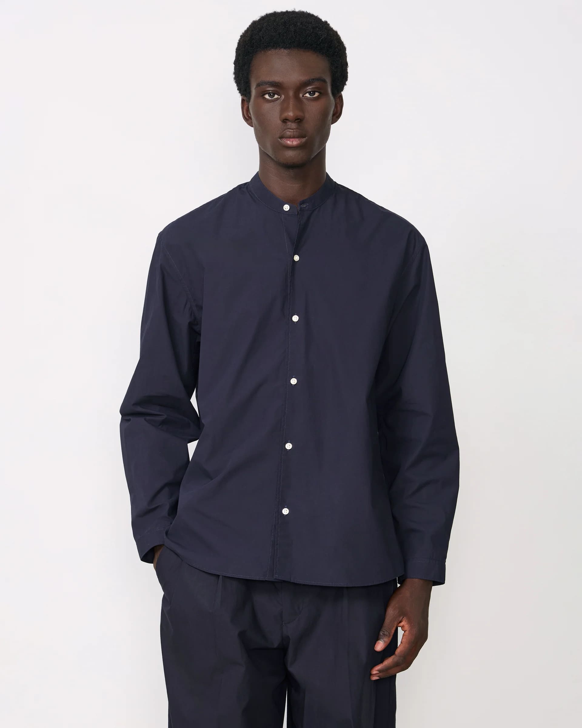 Cut in an oversized fit, the Jahlan Shirt offers a contemporary silhouette while maintaining the refined minimalism that defines Officine Générale. The band collar enhances its modern aesthetic, while the smooth poplin fabric ensures a polished appearance with natural comfort.