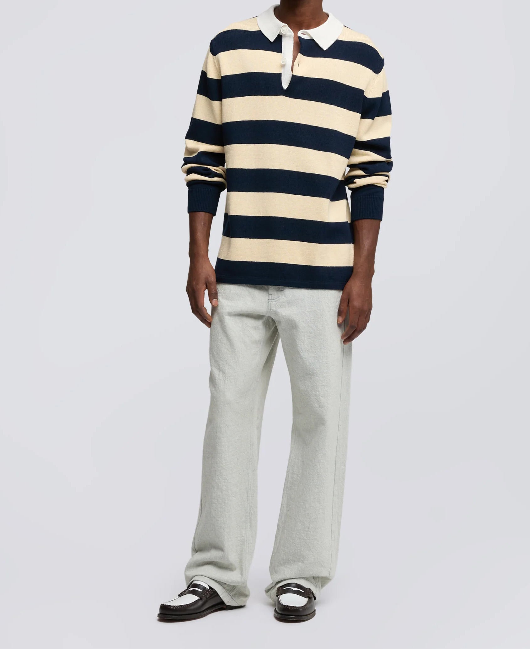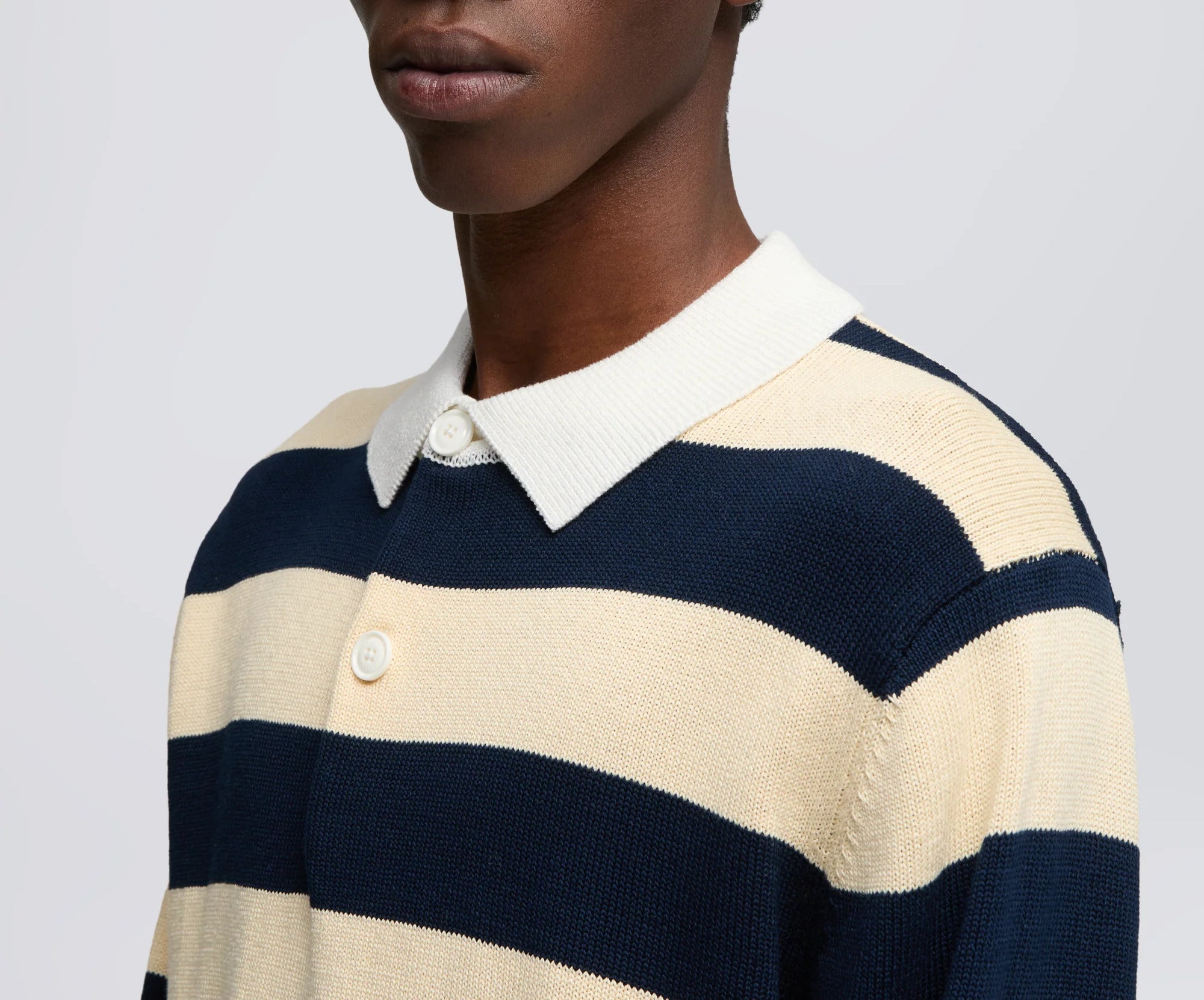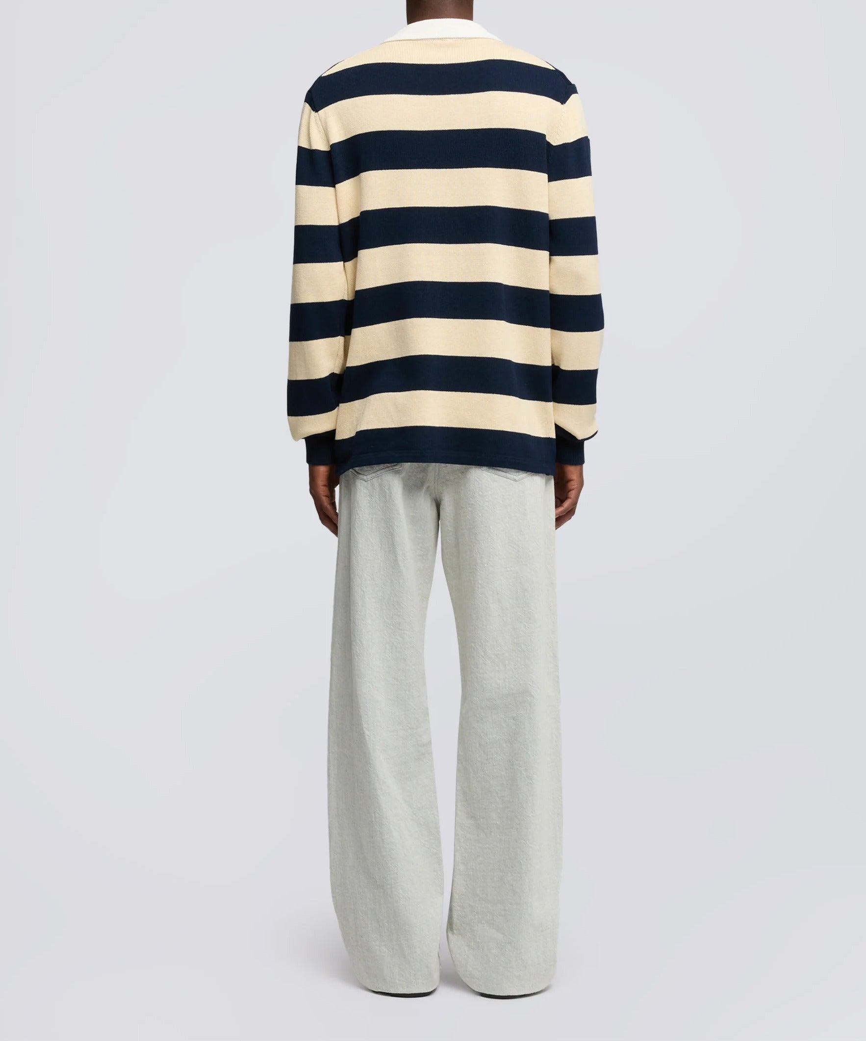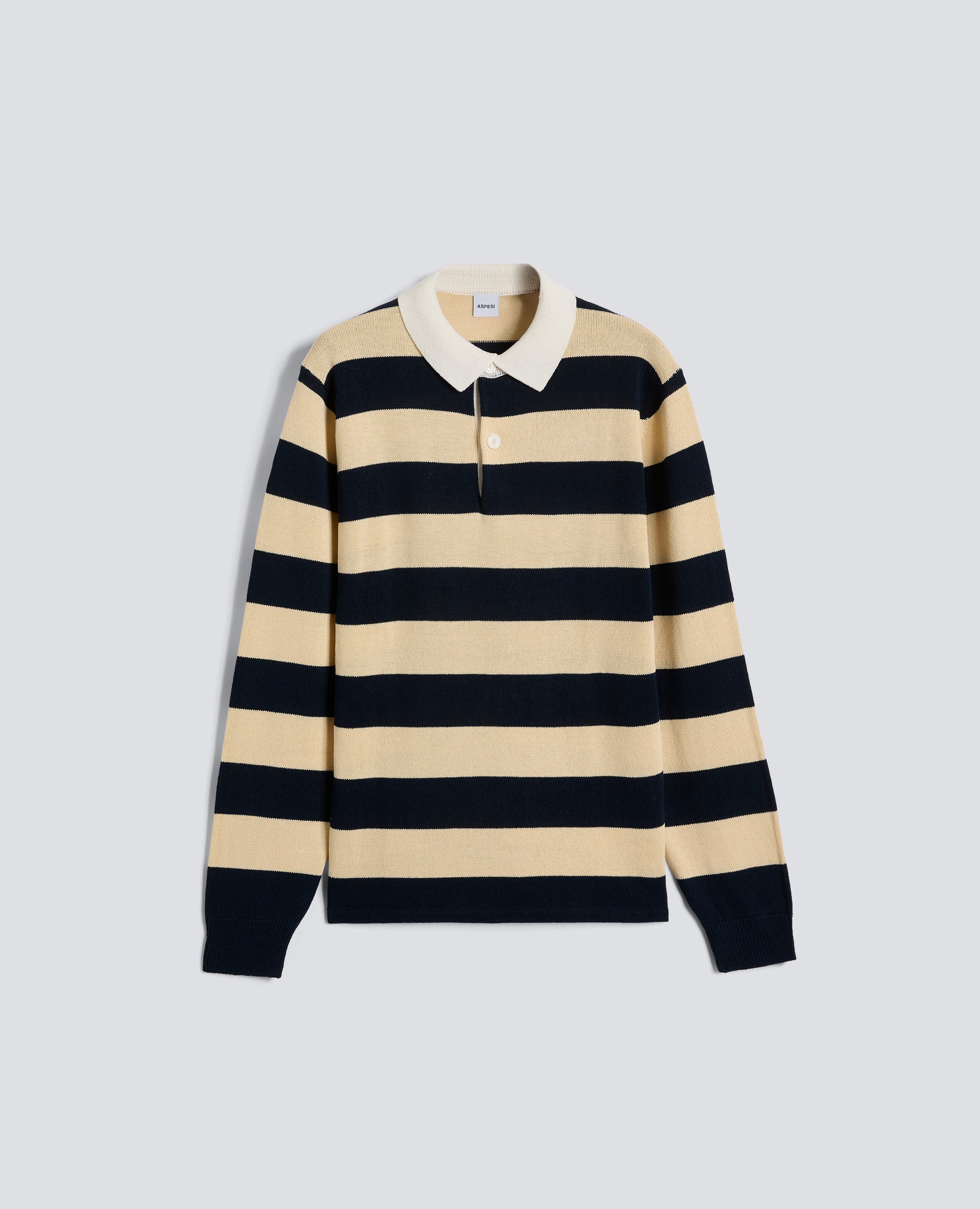 The Aspesi Knit Pullover Rugby Shirt in Corda/Blu reinterprets a classic rugby silhouette with refined Italian craftsmanship. Crafted from soft cotton yarn, this long-sleeve knit polo combines a structured yet comfortable feel with a clean, modern look. The bold horizontal stripe design adds character, while the two-button serafino placket and classic collar keep it timeless and versatile.