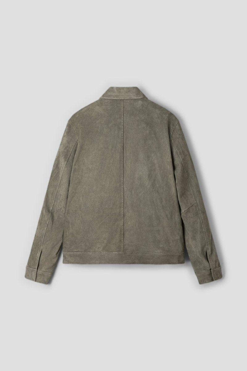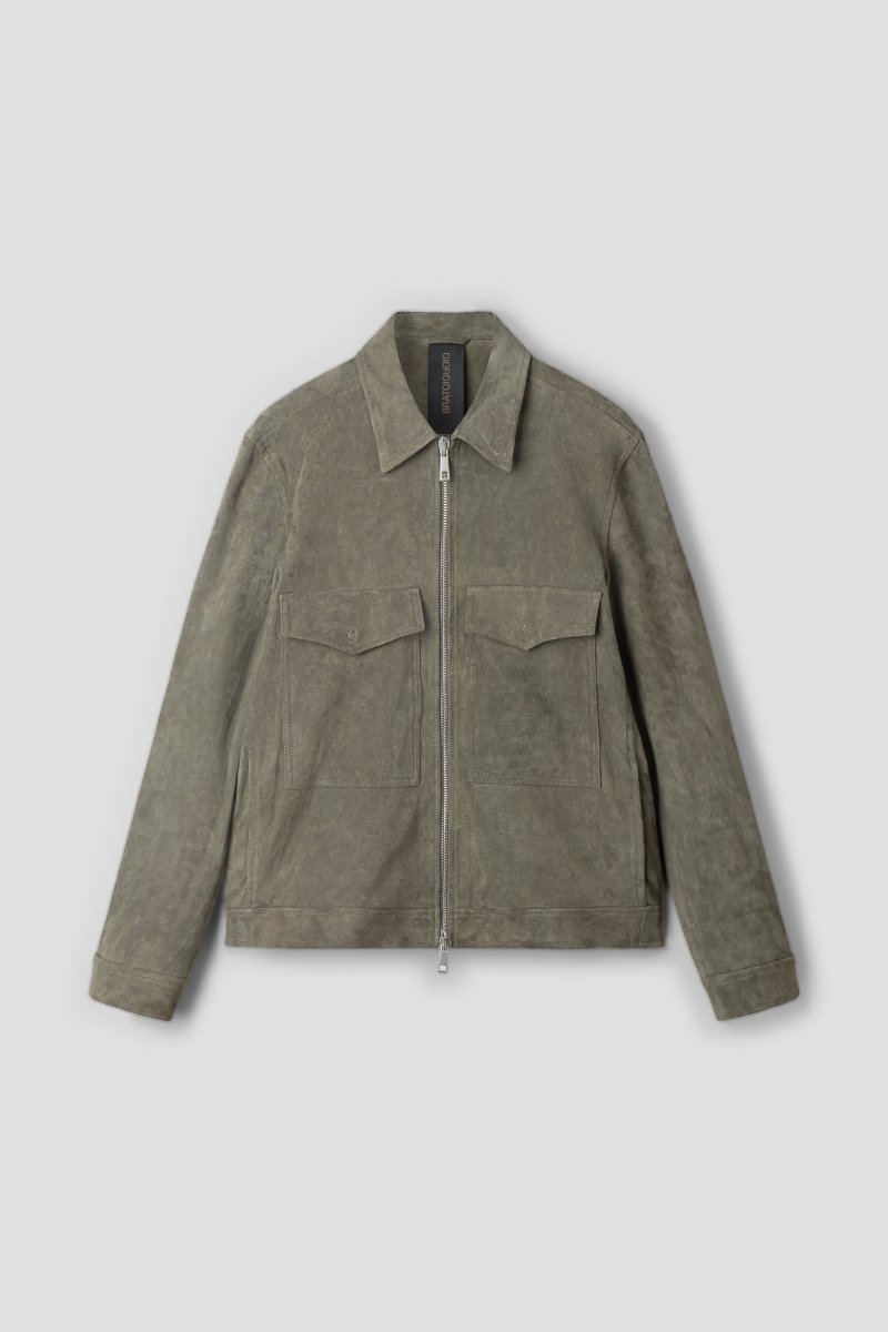 The clean flight-inspired silhouette features a classic collar, full front zip closure and two structured chest flap pockets, blending utilitarian references with refined Italian construction. The muted Swamp tone enhances the jacket’s depth and texture, highlighting the natural grain and artisanal finishing.
