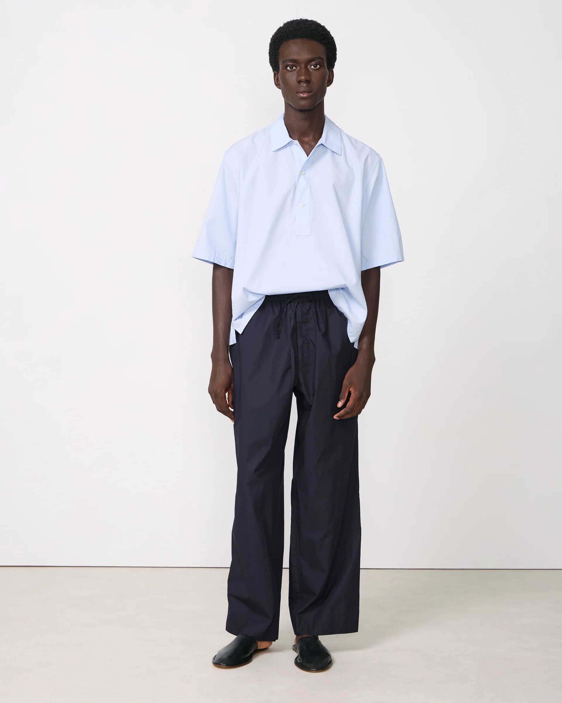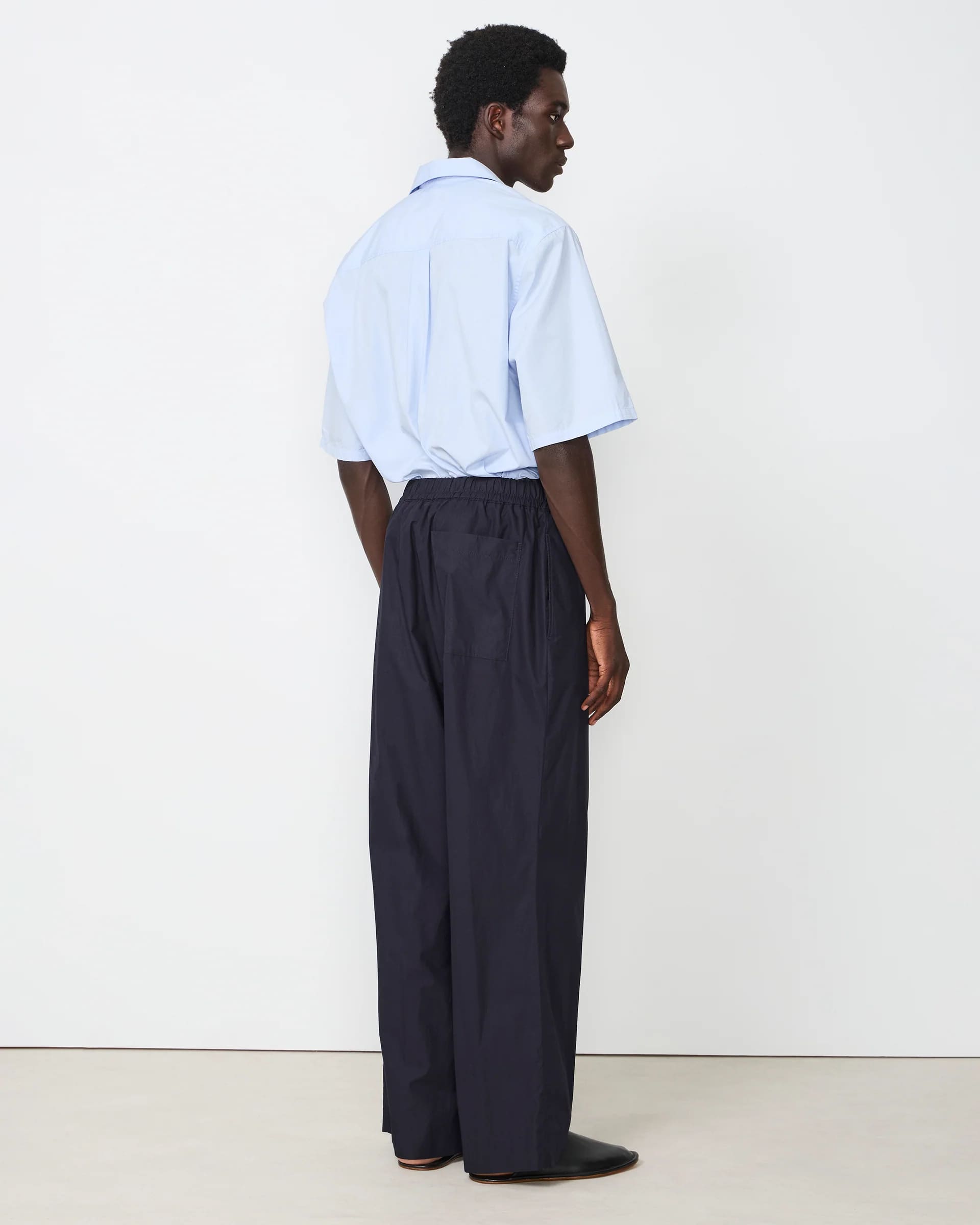 The wide silhouette and elastic waistband with drawstring provide a relaxed, modern fit while maintaining a polished look. Made from crisp yet soft organic cotton poplin, the fabric offers a lightweight feel and excellent breathability, making the Nilson Pants ideal for warmer seasons.