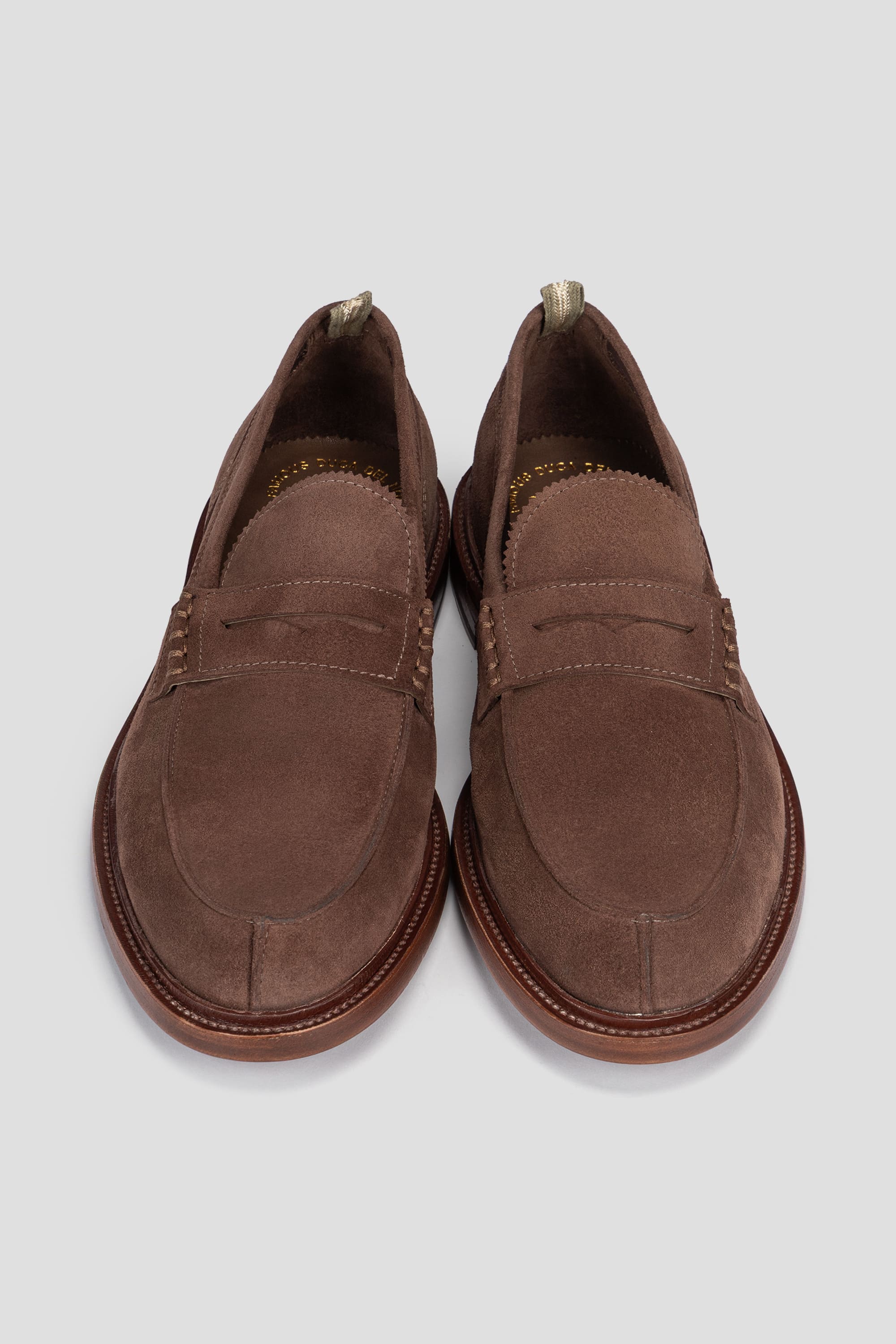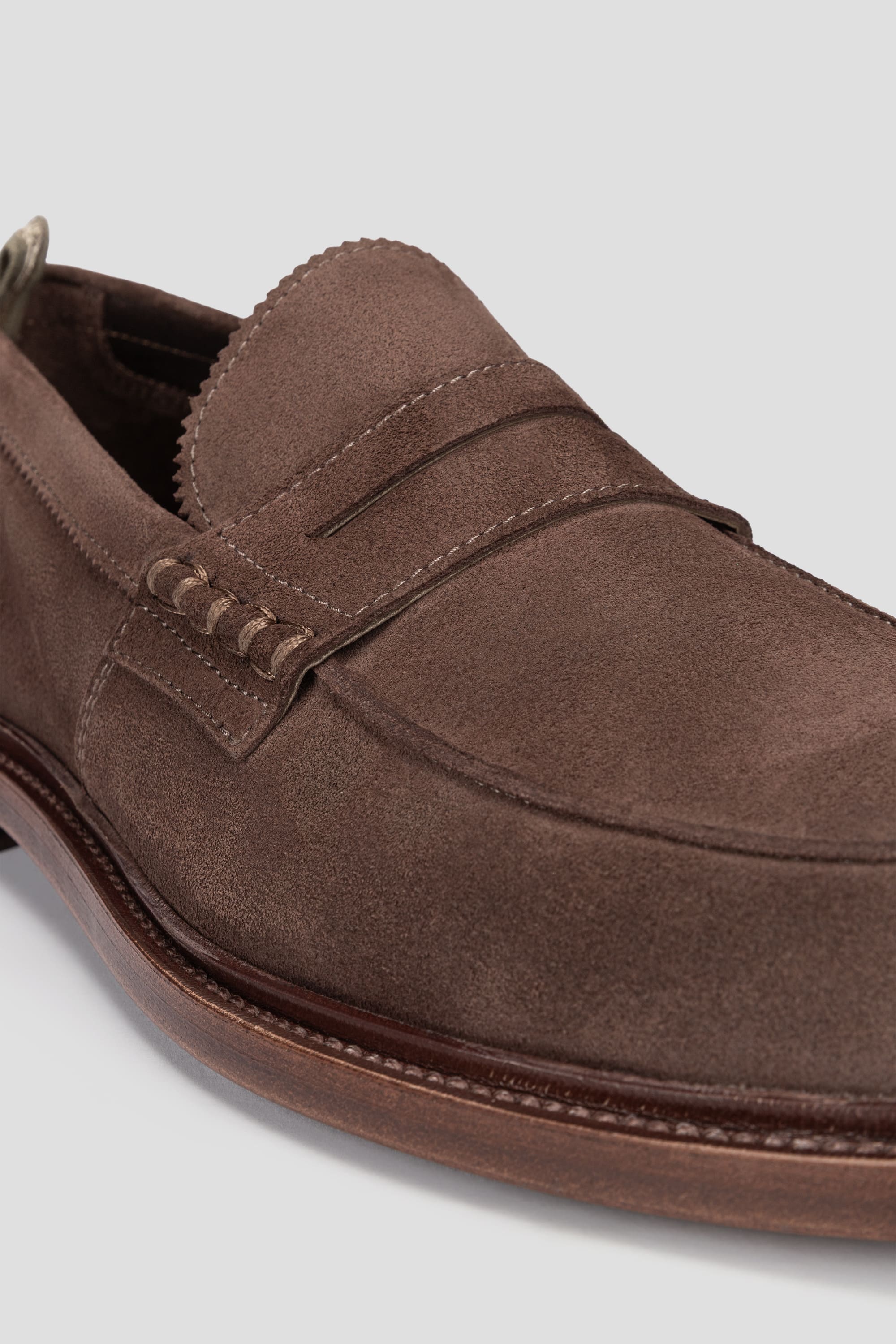 The minimalist design features a traditional penny strap, hand-stitched detailing and a slightly rounded toe for a modern yet classic profile. The warm Testa Di Moro tone highlights the rich texture of the suede while adding depth and versatility to the shoe.