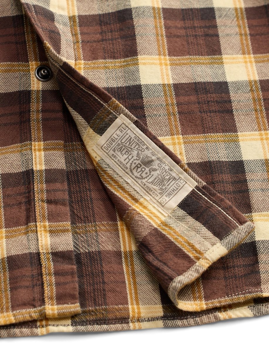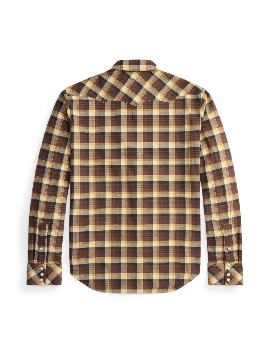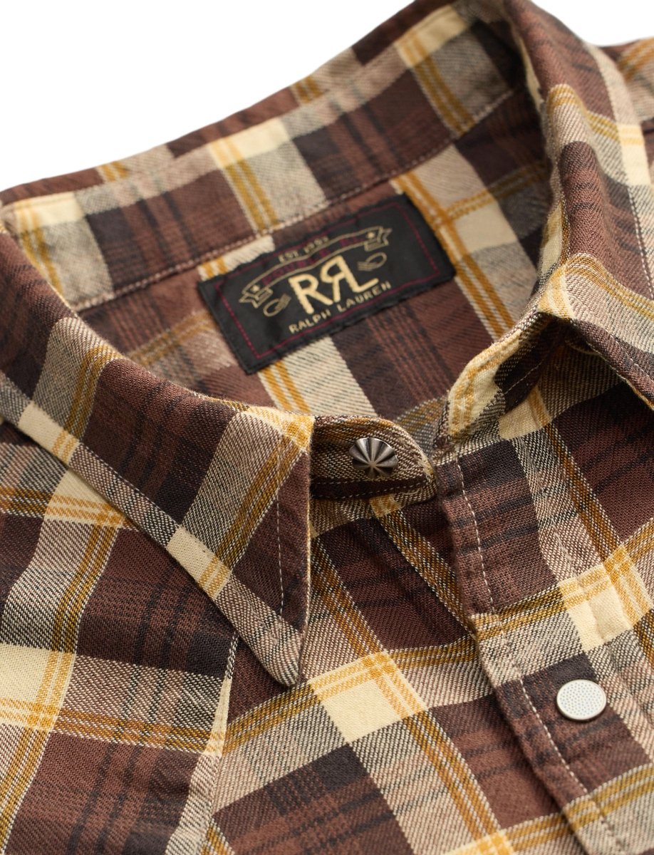 This slim-fit Western shirt is crafted from premium yarn-dyed cotton twill, offering durability, comfort, and a rich plaid character that improves with wear. Inspired by classic American Westernwear, it features authentic detailing such as bias-cut front and back yokes and dotted enameled snap buttons. A metal button at the collar adds a refined finishing touch. Cut in Double RL’s slimmest silhouette, the shirt is tailored close to the body and sleeves for a sharp, modern profile while maintaining a rugged heritage feel.