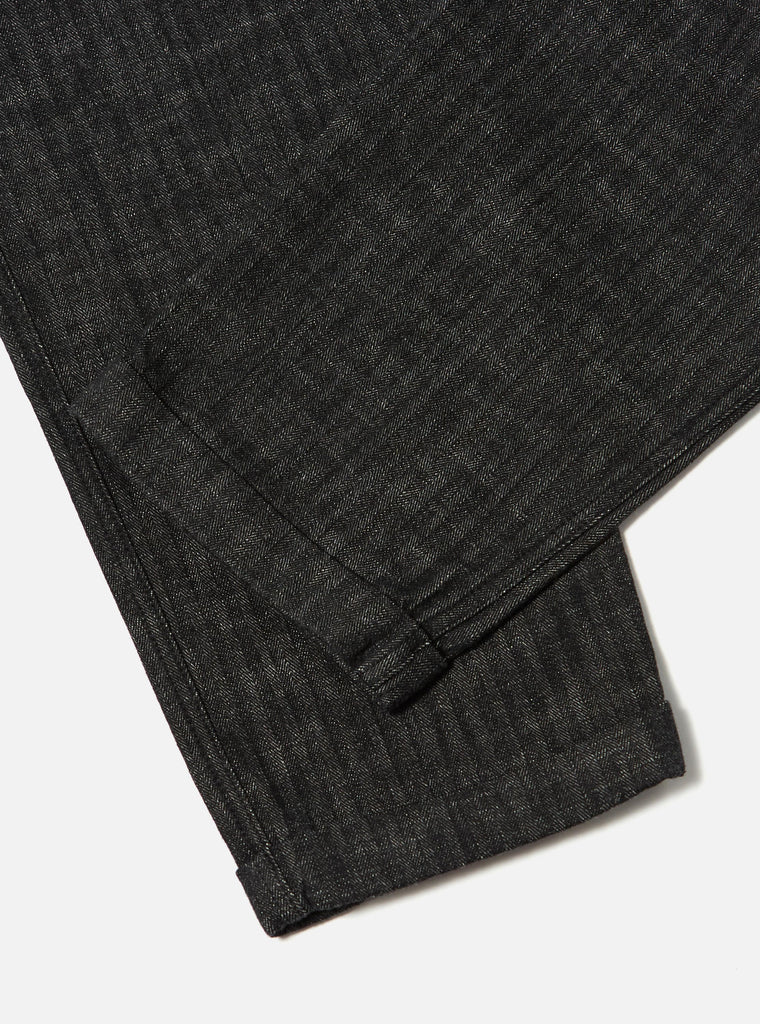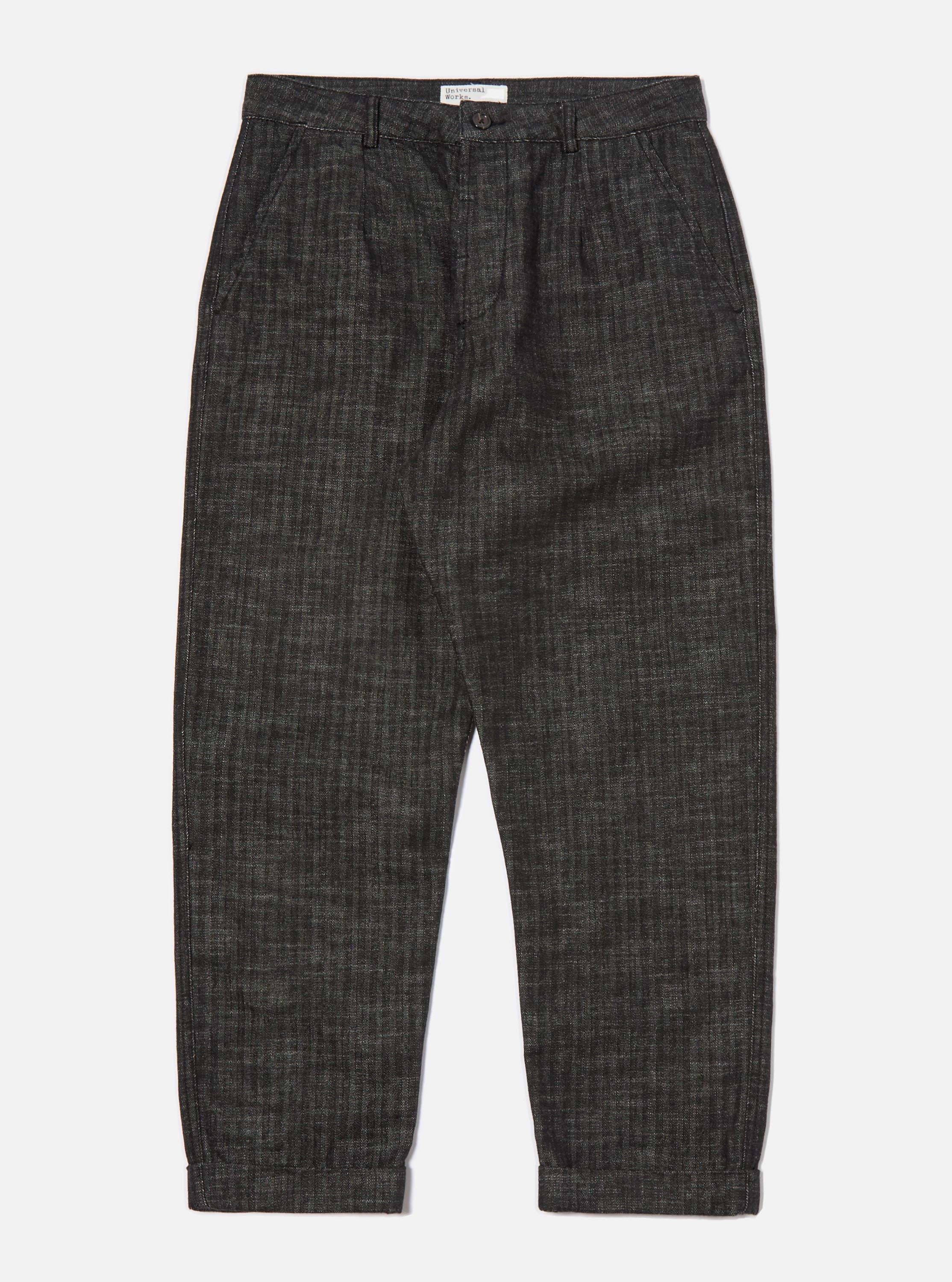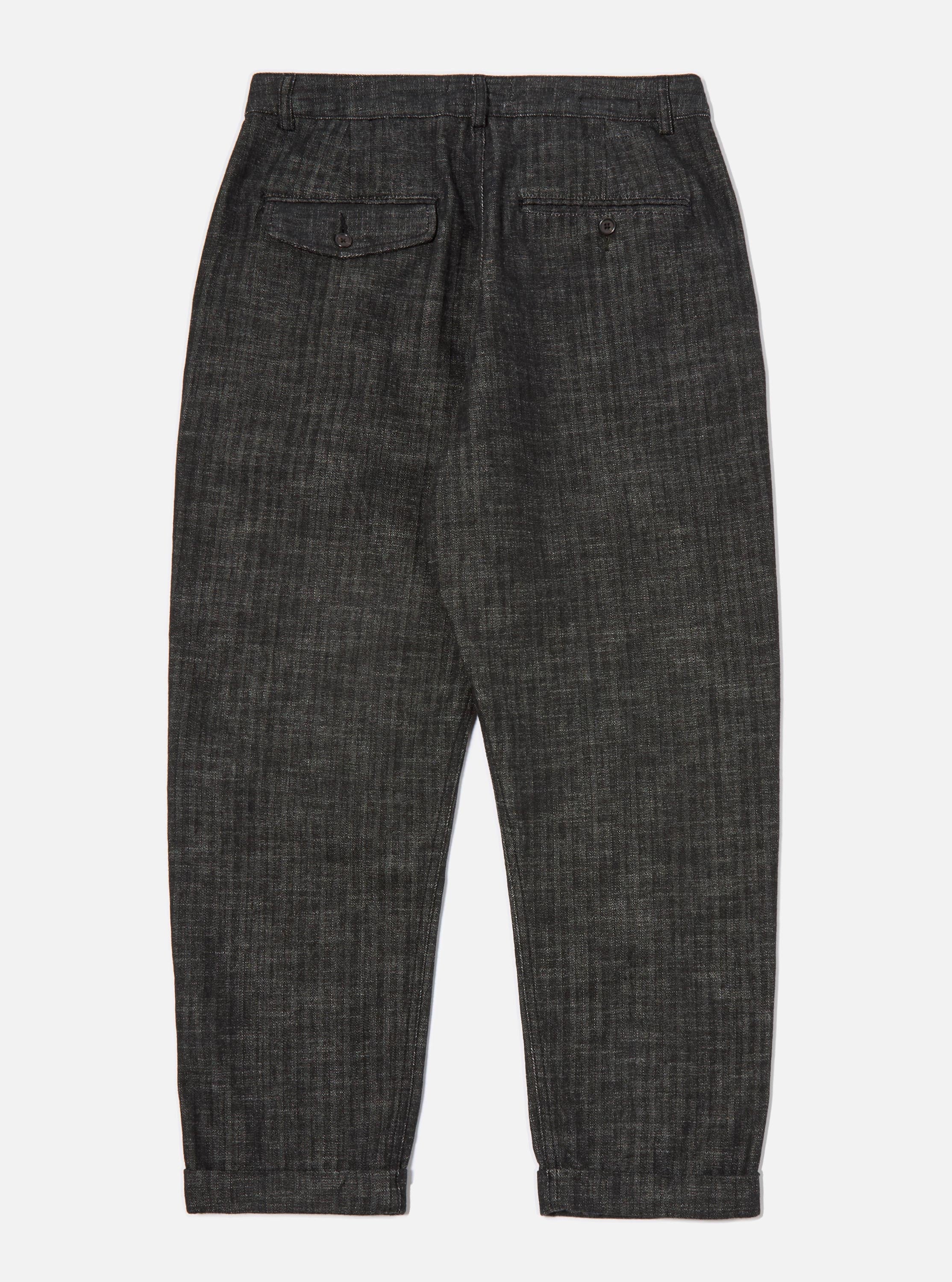 The Super Chino Denim by Universal Works redefines everyday trousers with a modern, relaxed silhouette. Made in Portugal from 100% cotton. These chinos feature a loose, wide fit that balances comfort with contemporary style. The herringbone denim fabric in black adds subtle texture and durability, while refined tailoring details such as pleats, French pockets and a buttoned back pocket highlight the brand’s commitment to craftsmanship. A versatile piece that works seamlessly from casual to smart looks.