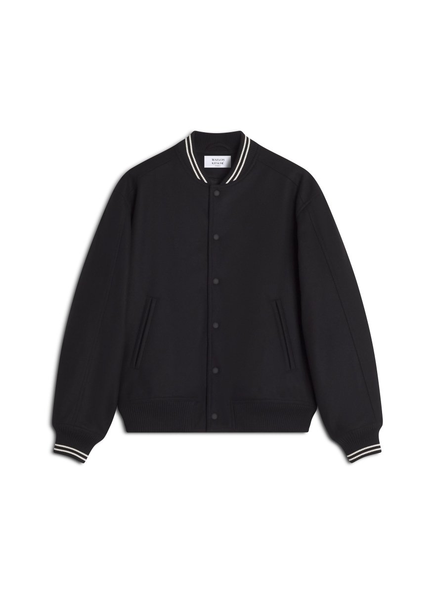 The Maison Kitsuné Teddy Jacket in Black reimagines the classic varsity style with elevated materials and refined detailing. Crafted from a luxurious wool and cashmere melton blend, this jacket combines warmth, softness, and structure for a timeless outerwear essential.