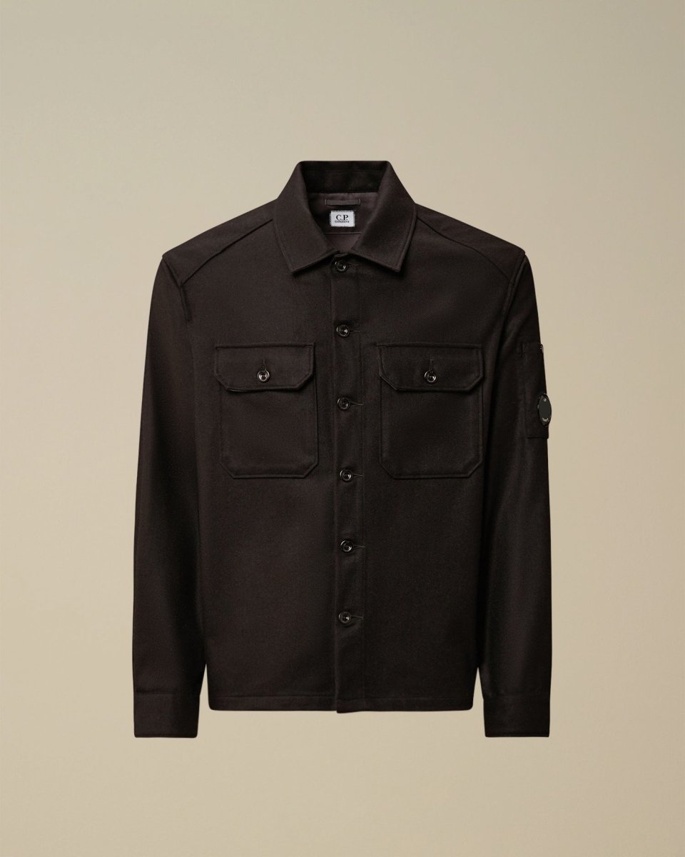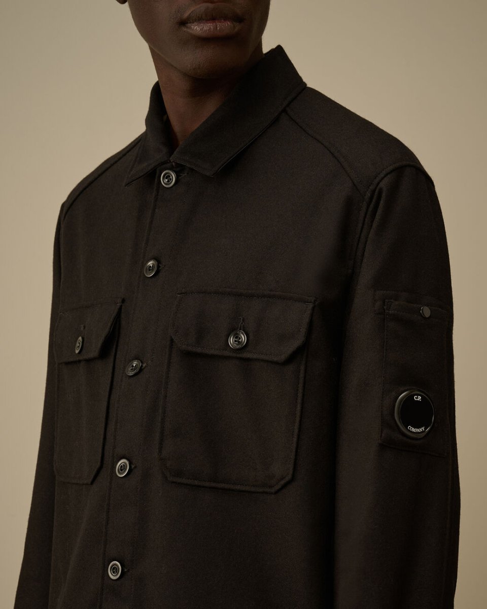 The C.P. Company Overshirt Felted in Black is crafted from a soft felted fabric that provides warmth, comfort and a refined texture. Designed with a classic collar, full button closure and two flap chest pockets for a functional, structured look. Finished with the signature C.P. Company Lens detail on the sleeve and adjustable buttoned cuffs. A versatile, regular-fit overshirt ideal for layering throughout the season.