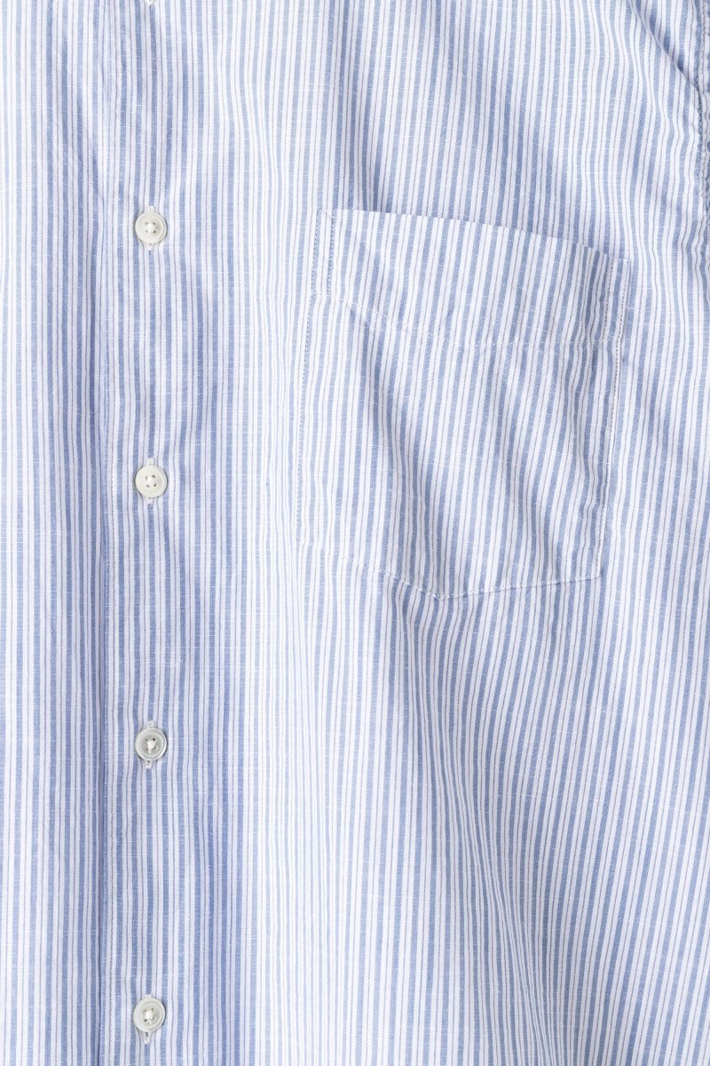 Its regular fit ensures comfort without excess volume, while the subtle vertical stripe pattern adds a timeless, versatile character. Finished with a chest pocket, gently rounded hem, and fine detailing, it transitions effortlessly from casual tailoring to laid-back denim looks.