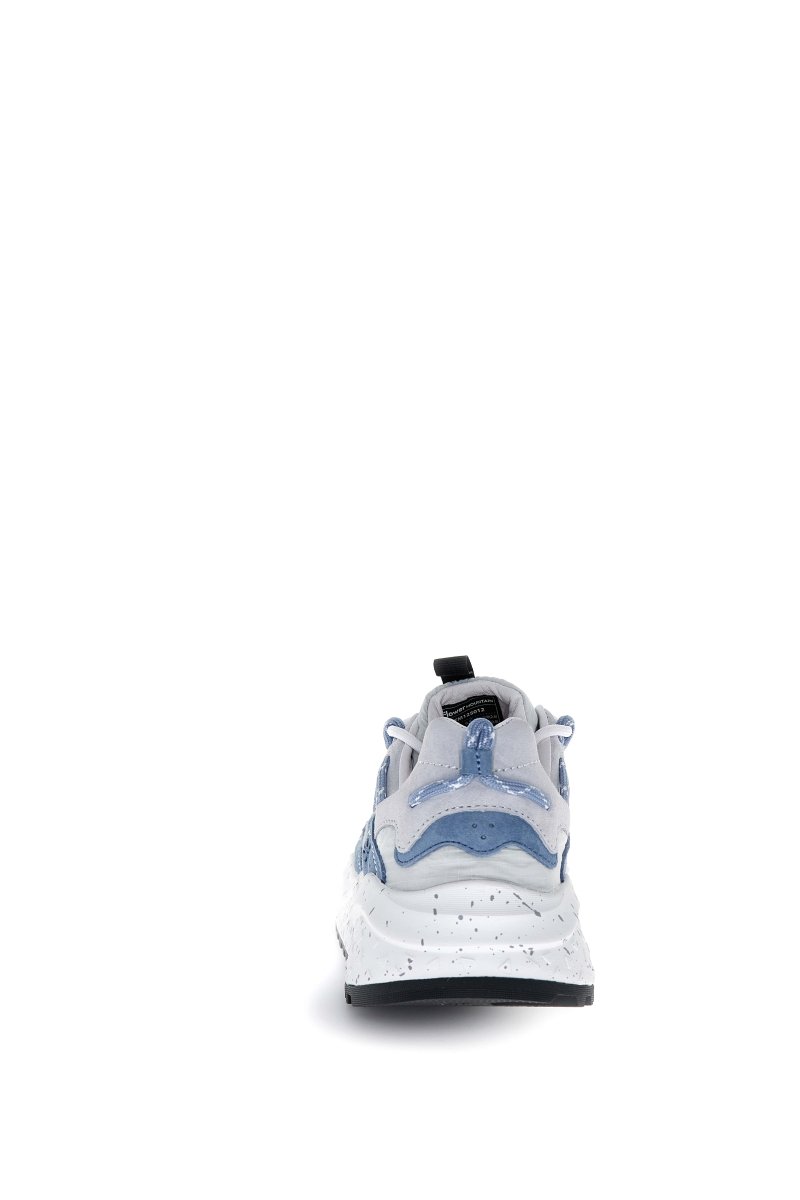 The Flower Mountain Yamabushi in Grey/Sugar/Paper/Navy blends technical outdoor DNA with refined, contemporary design. The upper combines breathable mesh with premium suede overlays in soft grey and sugar tones, contrasted by paper white details and deep navy accents for a balanced, modern look.