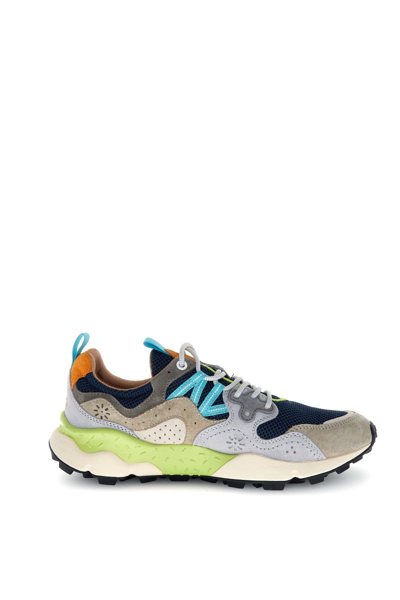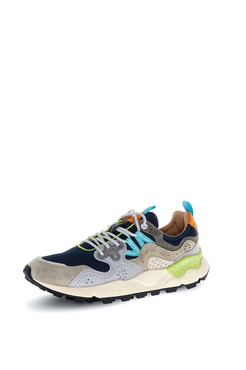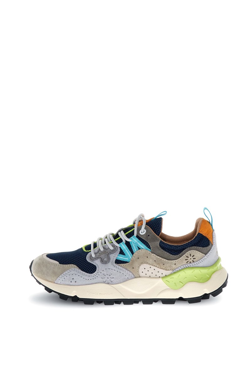 The Flower Mountain Yamano 3 in Light Grey/Navy combines technical outdoor DNA with contemporary lifestyle aesthetics. This signature model stands out through its dynamic panel construction, blending breathable navy mesh with soft light grey suede overlays and subtle beige accents. Turquoise side detailing and lime highlights add a modern contrast, while the orange heel tab injects a distinctive, sporty finish.