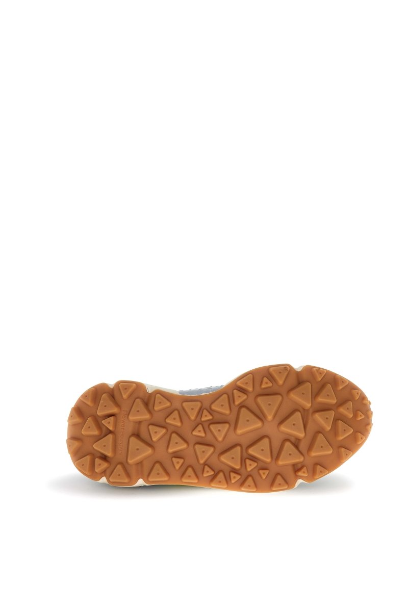 The upper features a mix of soft suede, breathable technical fabric and mesh panels in muted military green tones, contrasted by vibrant fluo green details and orange hiking-style laces. Decorative perforations and embroidered flower motifs underline Flower Mountain’s distinctive identity. The padded collar and leather lining ensure long-lasting comfort.