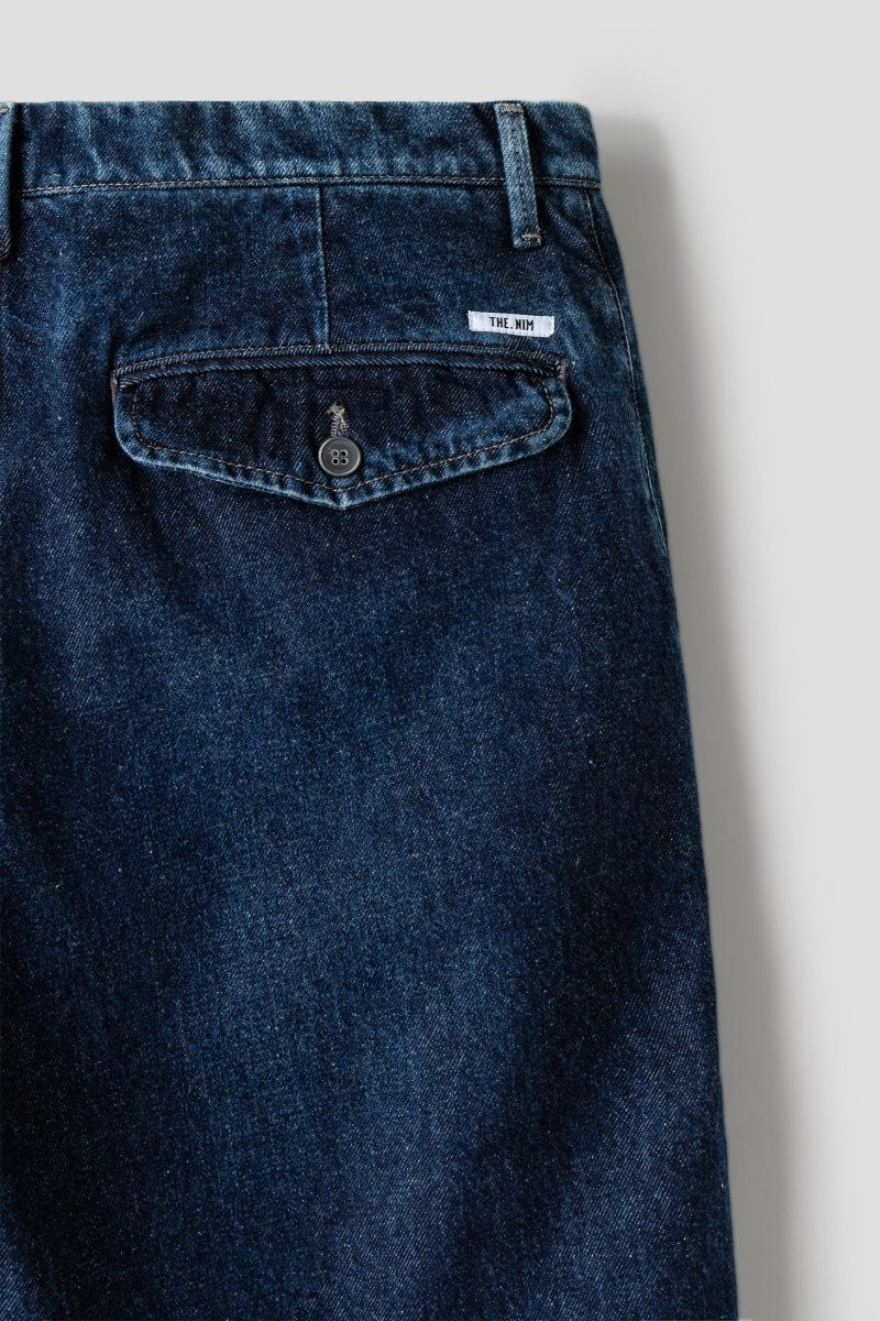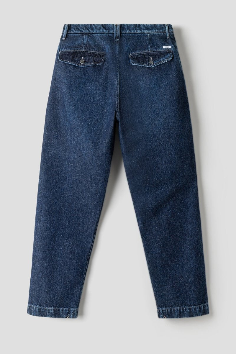 Gefertigt aus robustem, ungewaschenem Denim in Rigid Blue entwickelt die Hose mit der Zeit eine individuelle Patina. Front-Pleats, schräge Eingrifftaschen und geknöpfte Gesäßtaschen verleihen ihr eine sartoriale Note, während die klare Linienführung sie vielseitig kombinierbar macht – von Sneakern bis Loafern.