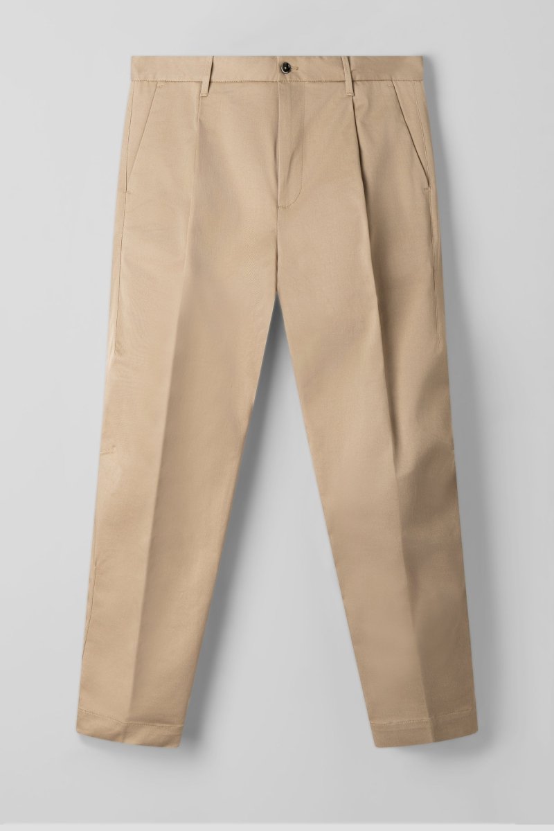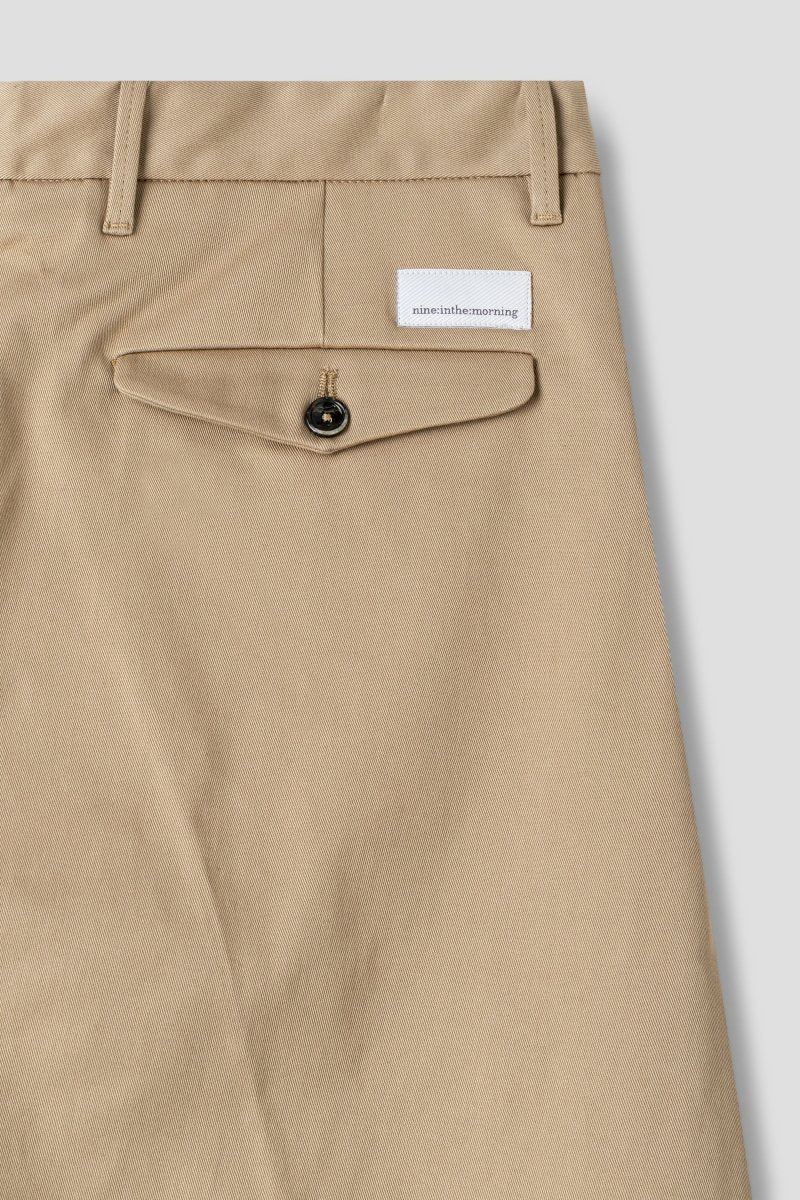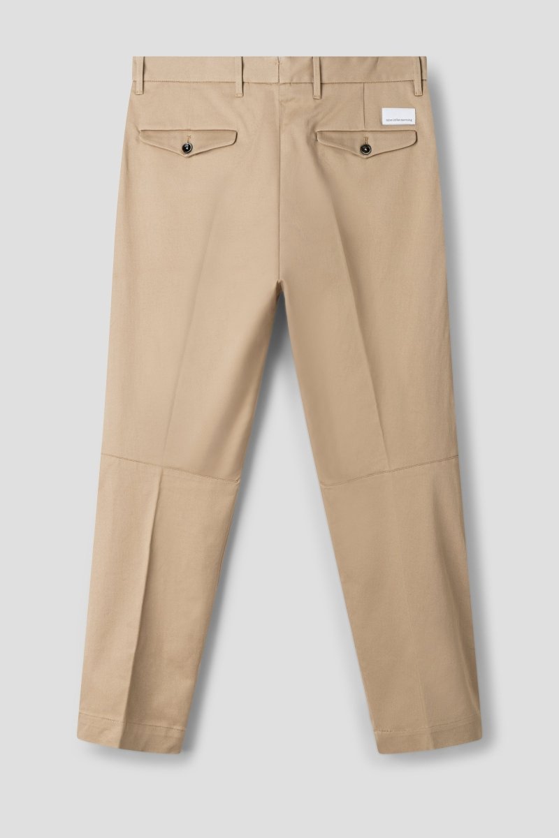 Crafted from premium cotton twill in a versatile beige tone, the fabric offers structure while maintaining comfort for everyday wear. The shortened leg length enhances the contemporary appeal, making it ideal for styling with loafers, sneakers or boots. Front slanted pockets and buttoned back flap pockets underline its tailored character, while belt loops allow for versatile styling options.