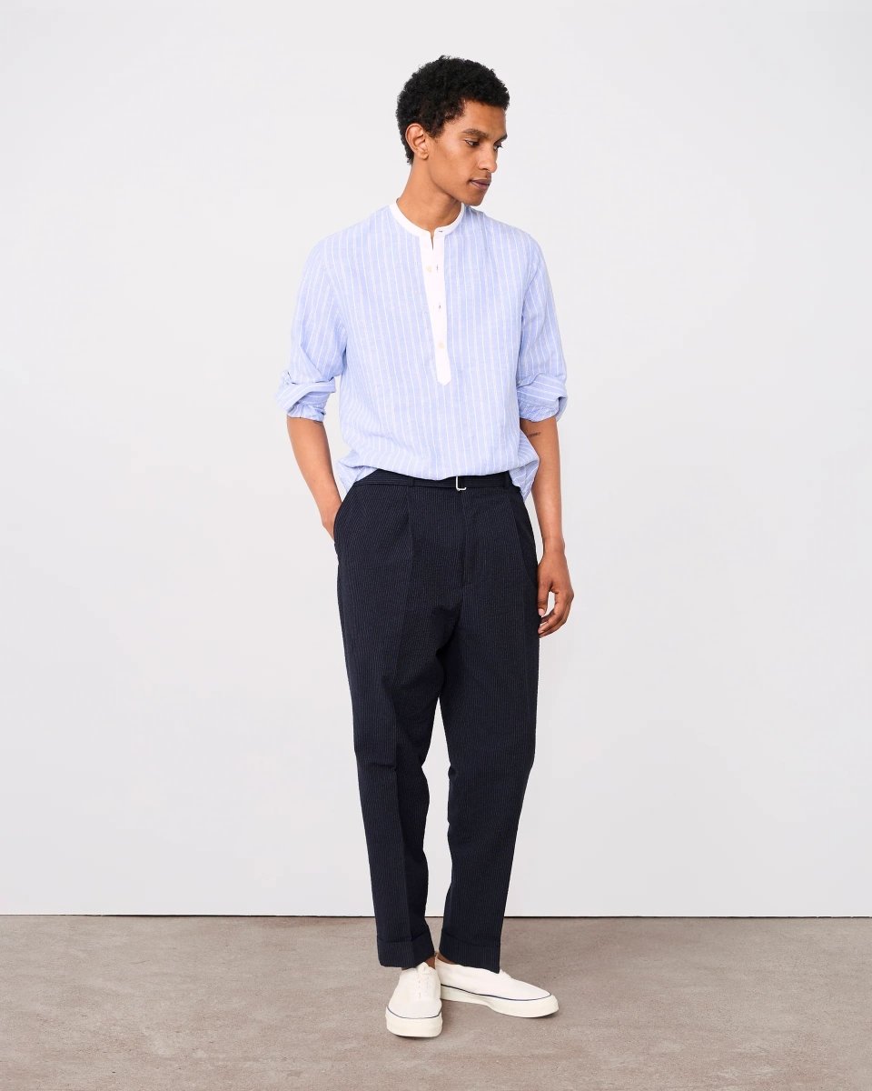 Designed with a cropped silhouette and a gently tapered leg, the Hugo Pants offer a modern yet timeless fit. A single Italian front pleat adds structure and elegance, while the textured seersucker fabric enhances airflow and creates the characteristic puckered finish.