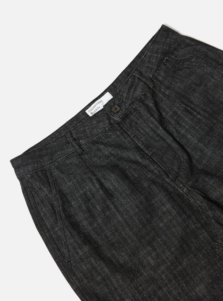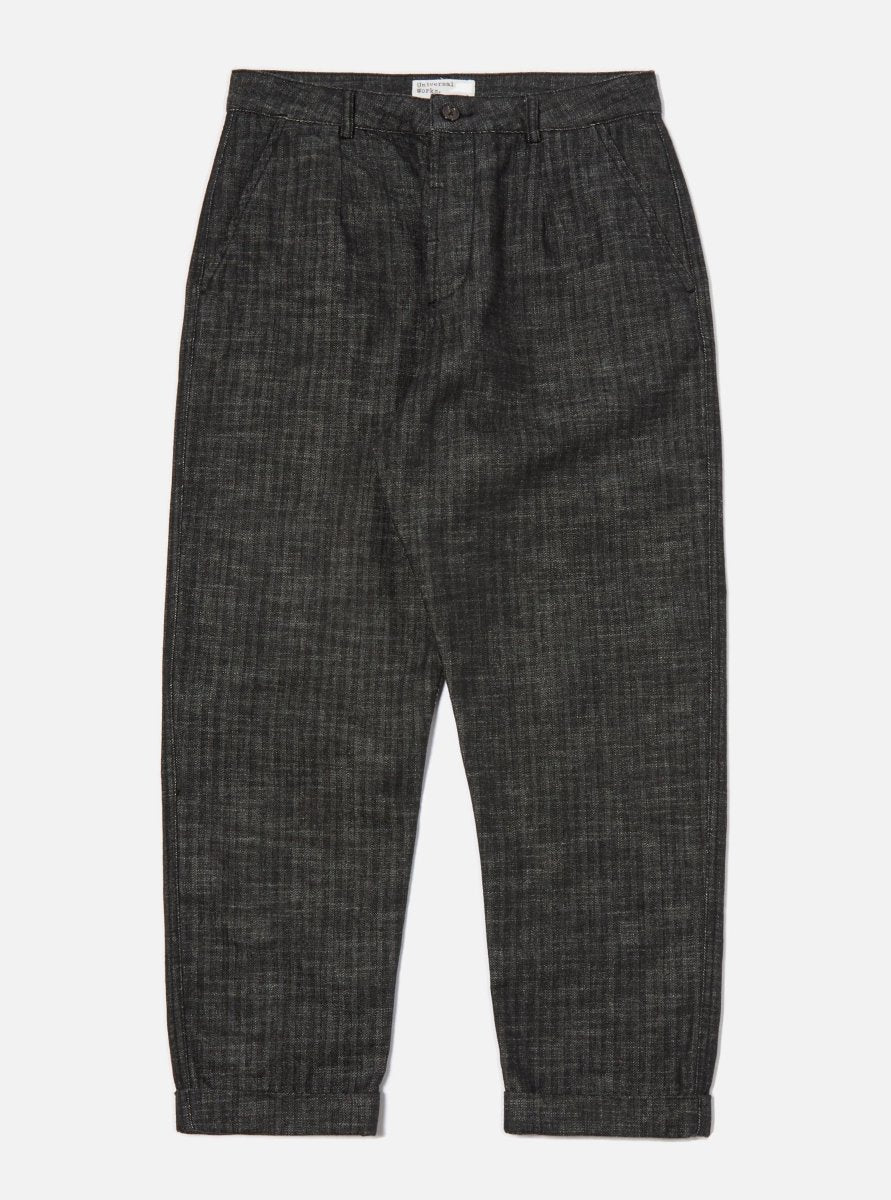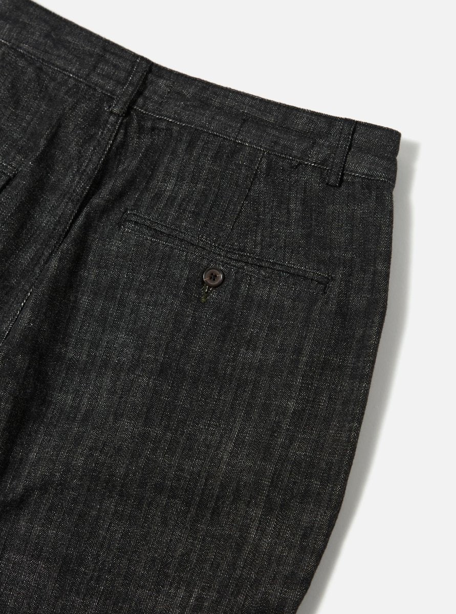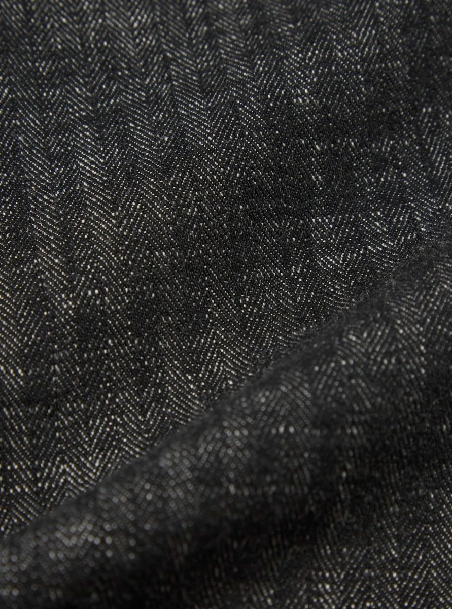 The Super Chino Denim by Universal Works redefines everyday trousers with a modern, relaxed silhouette. Made in Portugal from 100% cotton. These chinos feature a loose, wide fit that balances comfort with contemporary style. The herringbone denim fabric in black adds subtle texture and durability, while refined tailoring details such as pleats, French pockets and a buttoned back pocket highlight the brand’s commitment to craftsmanship. A versatile piece that works seamlessly from casual to smart looks.