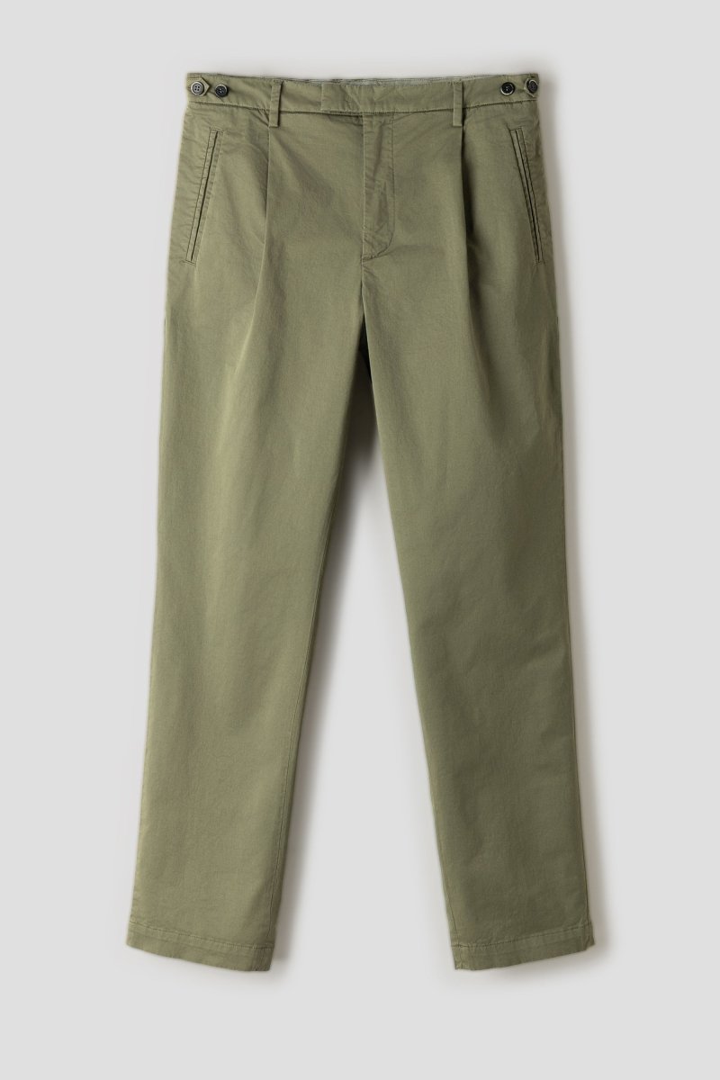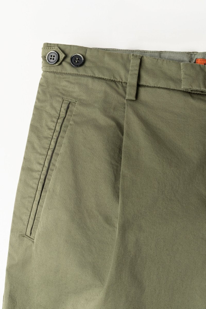 Crafted from lightweight stretch cotton gabardine, the fabric offers a smooth hand feel and subtle structure while ensuring day-long comfort. The soft finish enhances the natural drape, making these trousers equally suited for elevated everyday looks or modern business styling. The olive tone adds understated versatility, pairing effortlessly with crisp shirting, knitwear or tailored jackets.