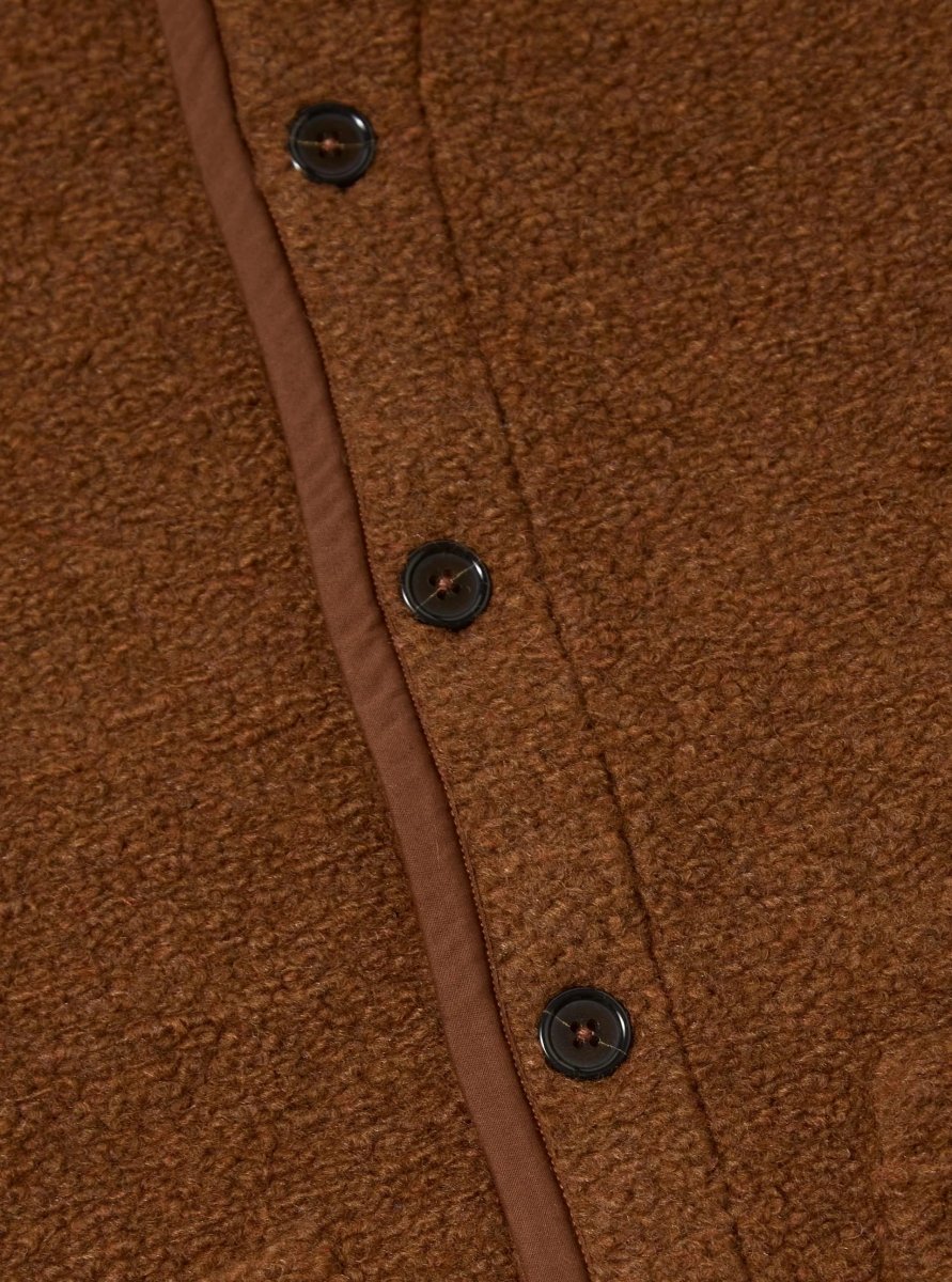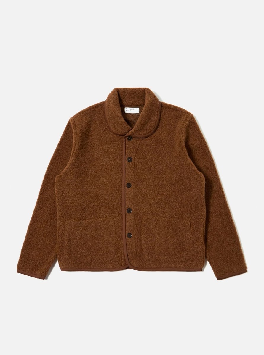 The Alvar Fleece Lancaster Jacket from Universal Works is a relaxed, easy-to-wear piece that brings warmth and texture to everyday layering. Made from soft, high-pile fleece in a rich Cumin tone, it features a distinctive shawl collar and cotton jersey binding along the edges for a refined finish. Two front patch pockets add both practicality and vintage-inspired character. Perfect as a lightweight outer layer or worn under a coat when the temperature drops.
