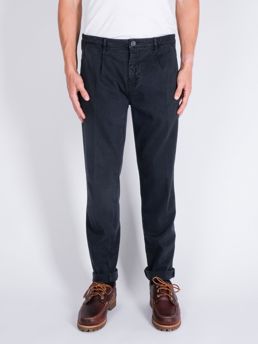 The chino from Italian brand The.Nim combines timeless style with premium craftsmanship. Made from durable bull denim, it features elegant pleats and a contemporary tapered fit. Practical side pockets and two back pockets provide functionality, while the zip fly adds a classic touch. Thanks to the garment-dyed finish, each pair has its own unique character. The fabric offers a soft touch yet remains firm and winter-ready – perfect for the colder season.